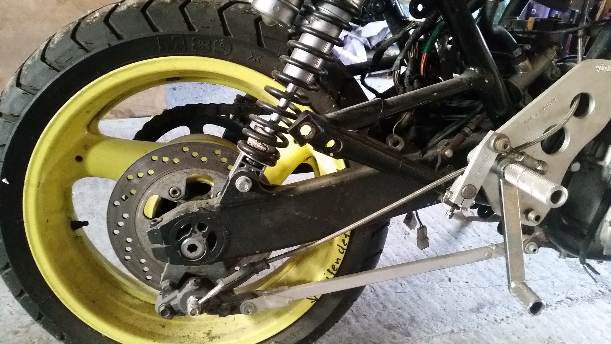 Vor Jahren hab ich mal einen anderen Motor eingebaut und mir eine Gabel,die Felgen und die Bremsanlage einer 89er Gixxer besorgt,sowie eine Schwinge der 750er Zephyr.