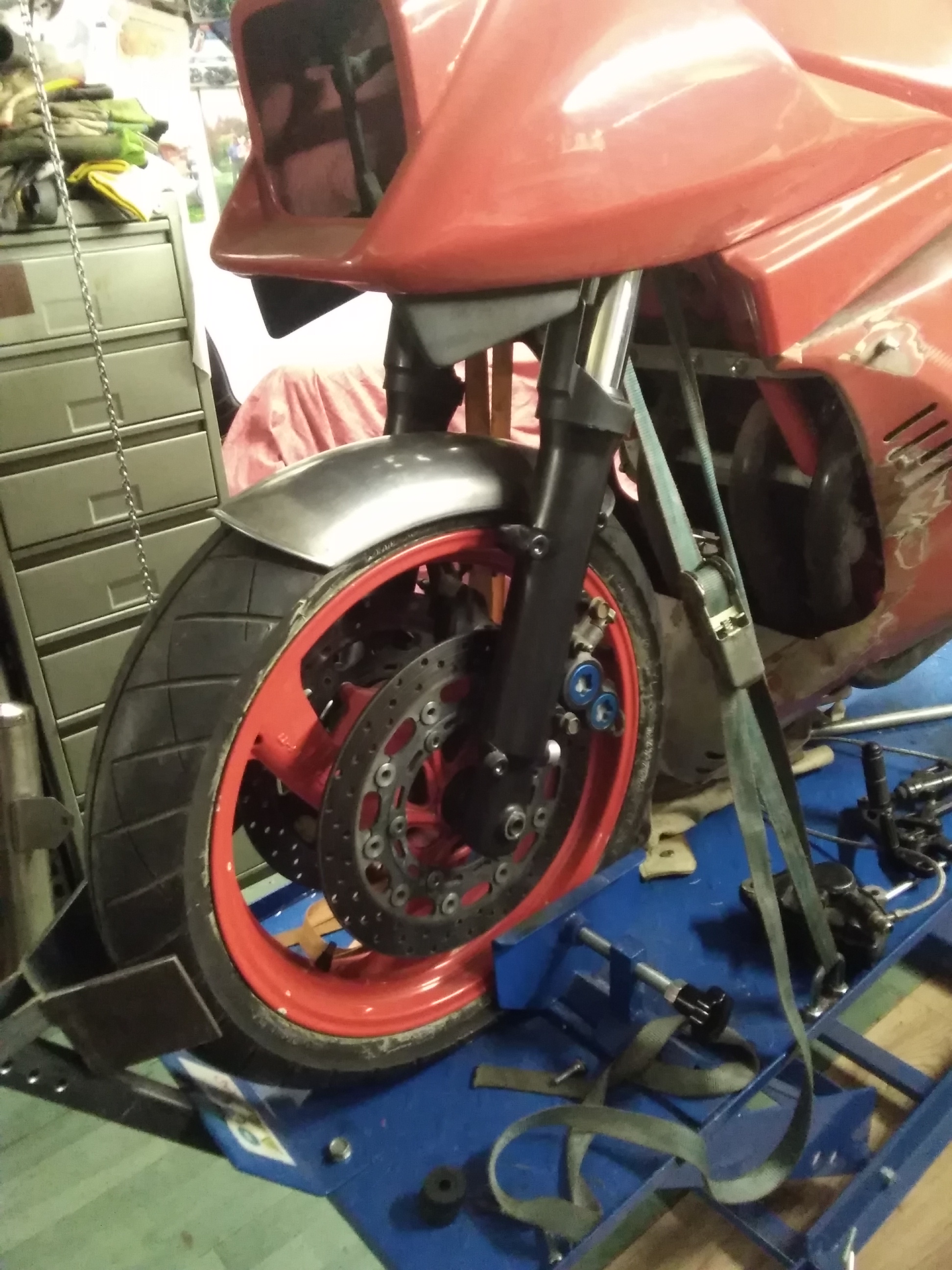Trotz der vielen Arbeit ist mal etwas Zeit gewesen, um an der rot /weißen weiter zu bauen. Frontend steht, Telegabel von der Yamaha YZF 1000 R eingebaut, Bremsscheiben von der R1.. Passt hervorragend.