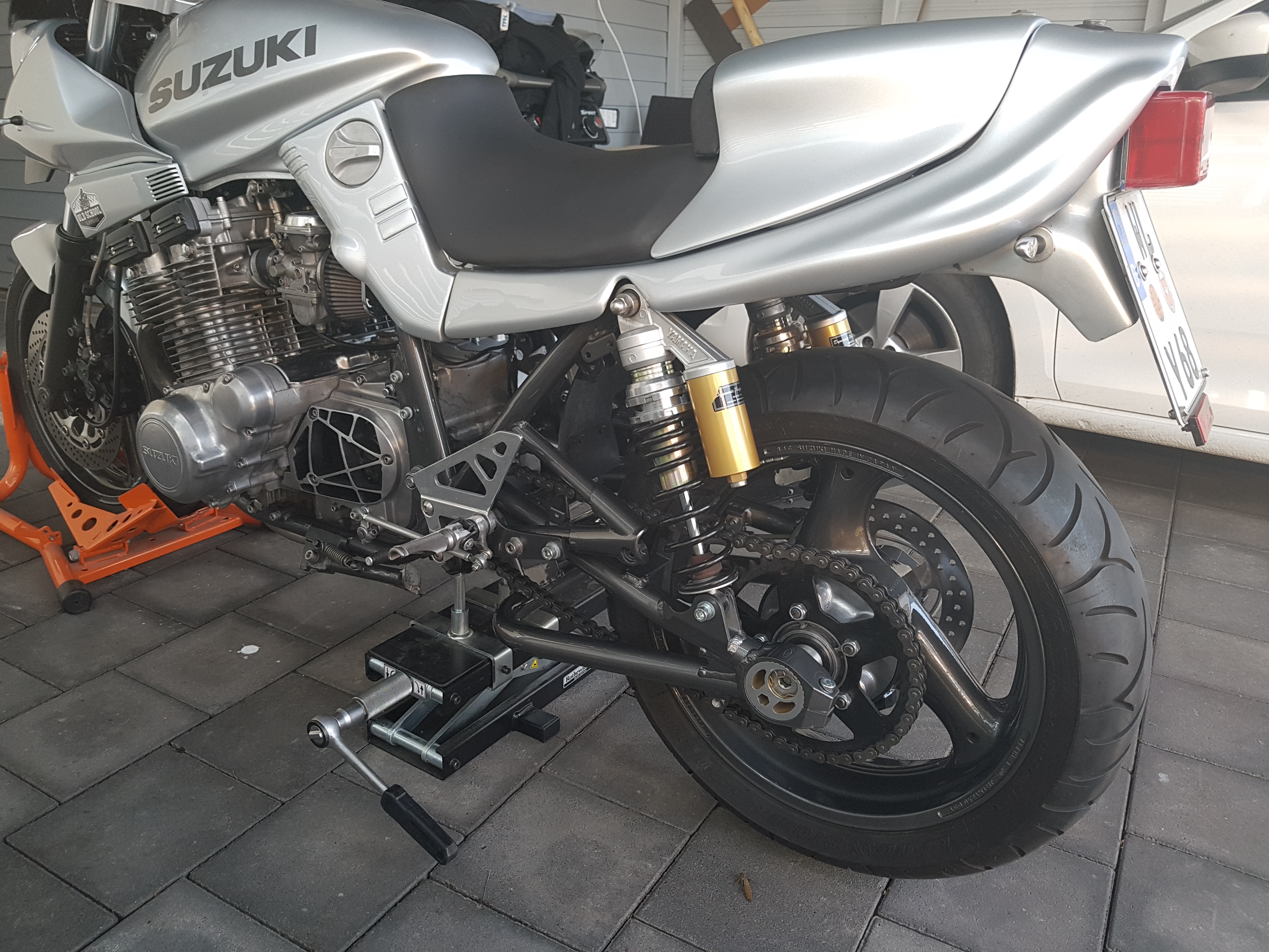 wie bereits an anderer Stelle geschildert, habe ich nun die ZRX 1100 Schwinge mit den passenden Dämpfern im Schuppen.