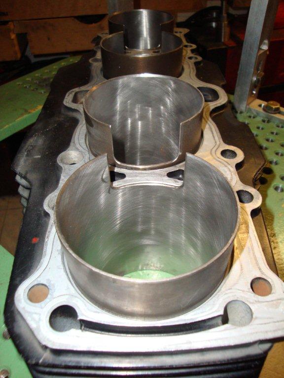In den K-Baureihen der Gixxer versieht Suzuki die Zylinderhülsen unten mit Ausnehmungen, die bewirken, daß die Luft, wenn sie von den Kolben auf dem Weg nach unten ins Kurbelgehäuse gedrückt wird, frei unter die jeweil nach oben laufen Kolben strömen kann. Der Motor dreht dann freier und Ölschäumen wird auch vermieden, so die Theorie. Doc Wrubel von Old School Superbikes wendet diese Technik auch bei den Luftgekühlten Motoren an. Da ich ihm die Zylinderreihe zum Aufbohren anvertraut habe, sollte er auch gleich die genannten Änderungen an den Hülsen und an den korrespondierenden Flächen im Kurbelgehäuse vornehmen.