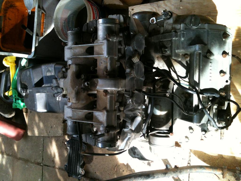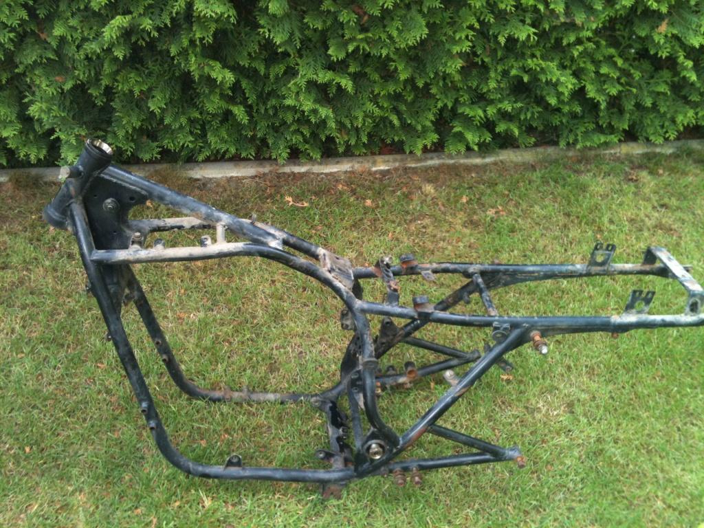 , das ist ne Kawa) nach 13 Jahren Standzeit in der Garage wieder erfolgreich reaktiviert habe, bin ich jetzt an das Großprojekt Katana gegangen und habe sie komplett zerlegt. Rahmen, Felgen, Schwinge und diverse andere Blechteile werde ich demnächst zum Strahler bringen und danach Kunststoffbeschichten. Der Auspuff wurde bereits vor 7 Jahren von einem Bekannten geschweißßt. Allerdings hat er dabei den Asupuff fest an die Krümmer angeschweißt