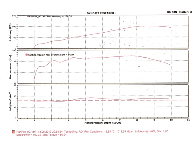 Der "Prüfstandmeister" meinte ca. 10% drauf, ergibt dann die Motorleistung!
