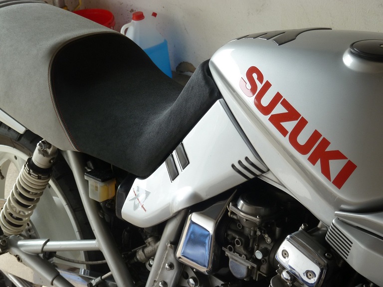 Nachdem ich ja nun den grössten Teil der saison ziemlich Pech hatte ( der eine oder andere wird sich erinnern, Stichwort Auspuff) gibts jetzt was gutes zu vermelden. Ich hatte vor geraumer Zeit mal ne verranzte Sitzbank bei E.ay geschossen, und wollte damit irgendwann mal was machen. Hab ich jetzt. Und zwar hab ich sie beziehen lassen mit einem Material welches in alle Richtungen dehnbar ist, und rau im "Look and Feel". Das war mir wichtig, denn ich fand immer dass glatte Bezüge speckig aussehen, irgendwie etwas wurstig, und die orginal Sitzbank fand ich immer Klasse. Die verschmutzt aber recht schnell und sieht dann eben auch nimmer sooo doll aus. Daher also nach etlichen Materialproben dieses Zeugs gewählt. Als kleines Schmankerl hab ich die Naht orange machen lassen. Das Ergebnis finde ich saugeil, um es mal so zu sagen. Wer noch nen guten Betrieb sucht mag mir ne PM schreiben, dann sag ich gern wer das gemacht hat ( Schleichwerbungsalarm). Nebenbei war der Preis mehr als akzeptabel. Auf dem einen Bild siehts so ais als ob die Bank nicht richtig sitzt, ist aber nur weil ich sie nur locker aufliegen hatte, und nicht eingerastet habe. So. Ich hoffe mal, das war der Wendepunkt, und rufe Euch ein fröhliches " Auspuffe werden eh überbewertet" zu, auf bald, Gruss,