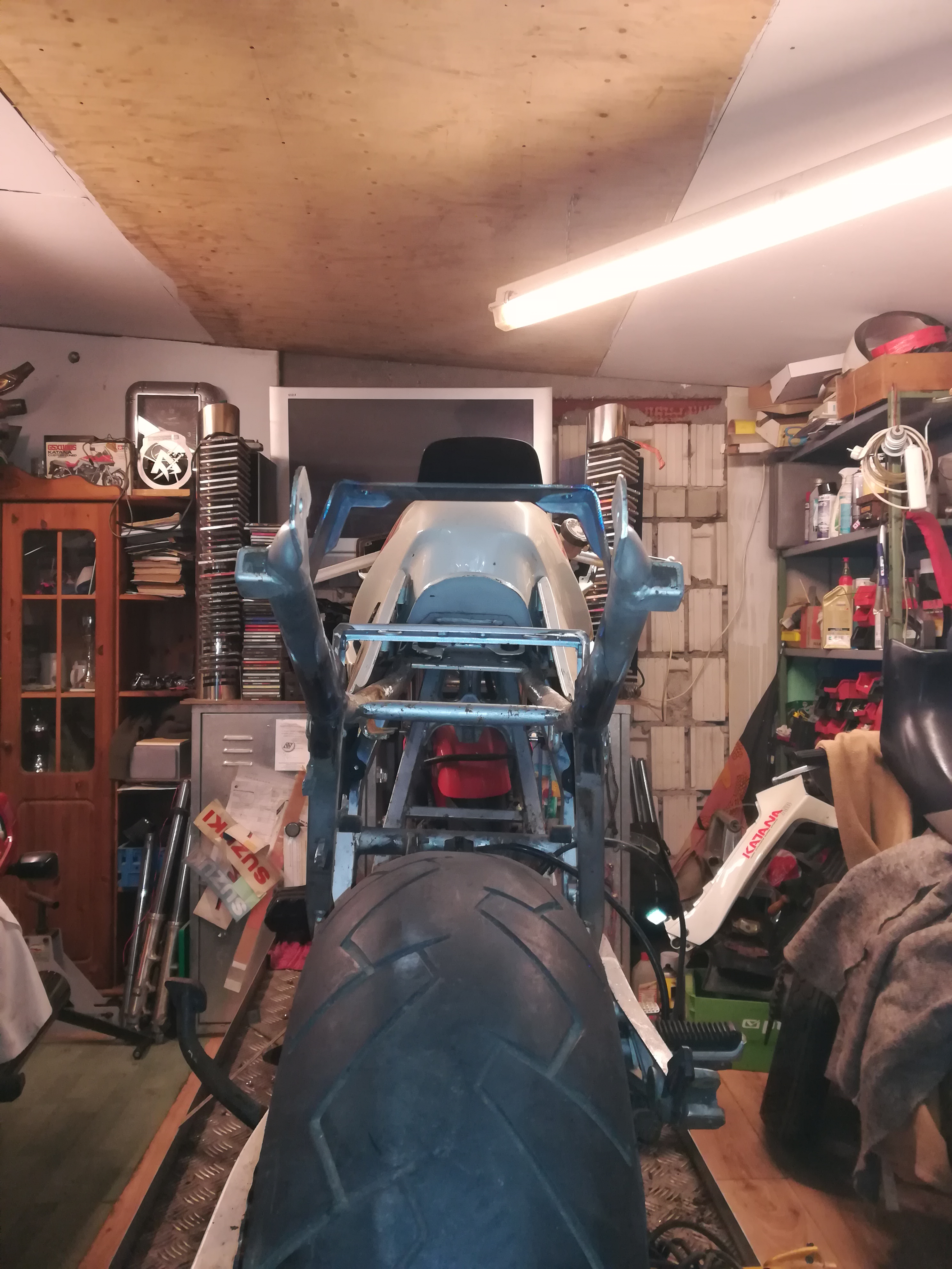 Ich weiß gar nicht, was die die sich bei Gimbel gedacht haben. Jetzt hatte ich schon gedacht, er wäre von einem anderen Modell. Steht aber 750 bzw 1100 Katana drinne. Na jedenfalls ist soweit ausgeartet, das ich die Endrohre abgetrennt habe, die Verkleidung halb zerstört habe, mit Holzkeile ausgerichtet habe, das es halbwegs passend ist. Im Endeffekt war ich bei meinem Seelentröster REWE, und hab erstmal Bier gekauft, um mich zu beruhigen. Und kann mir dann schon die nächste Idee. Ich wollte ja schon immer ein Wechselhöcker mit integrierter Sitzbank bauen. Und da die Flex schon draußen war, ran an den Rahmen. Fragt mich nicht über das ganze warum, weshalb wieso, ob ich Drogen nehme, wieviel und welche.was sagt der TÜV oder die Rennleitung. Wissenschaftliche Erklärung mit 4Buchstaben, " IS SO". na jedenfalls kann ich jetzt mit 2 Sitzbänken fahren, wechselseitig natürlich. Bin noch am überlegen, ob ich vielleicht noch noch Originale Sitzbank dazu nehme. So, hier die ersten Bilder