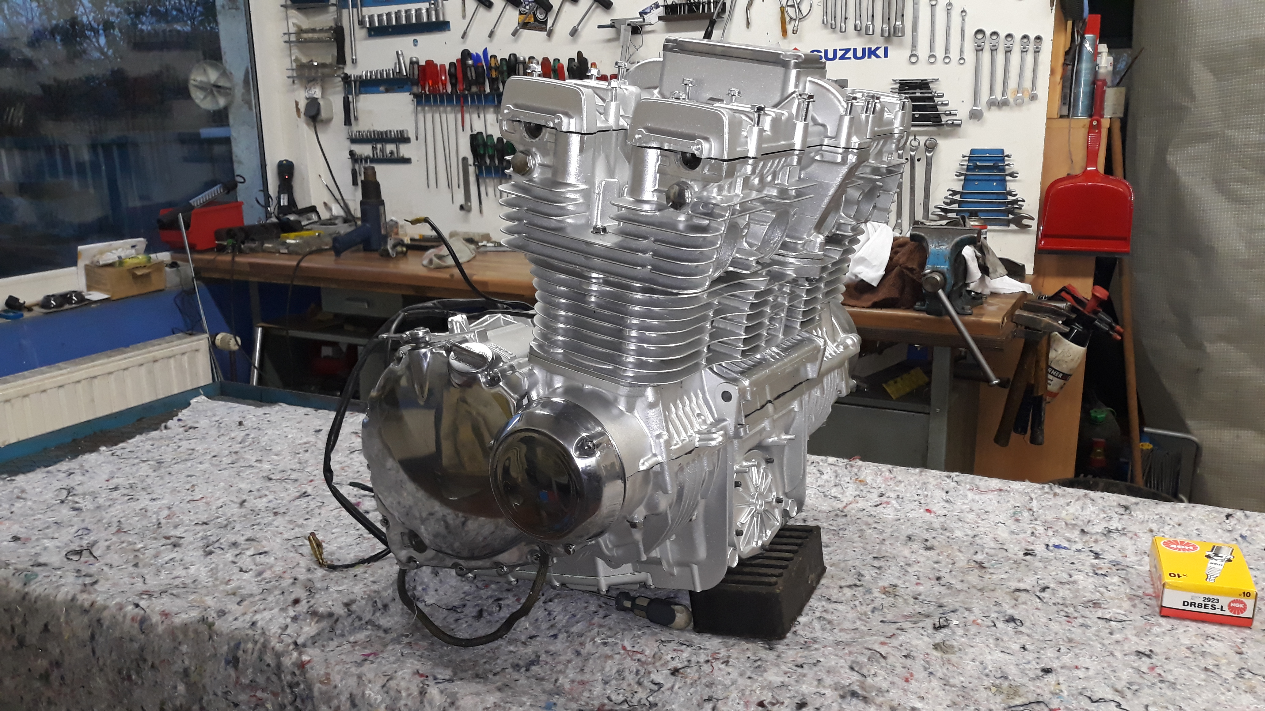 Neue Kolben, Kurbelwelle wuchten, Zylinder planen, alles strahlen und lackieren.