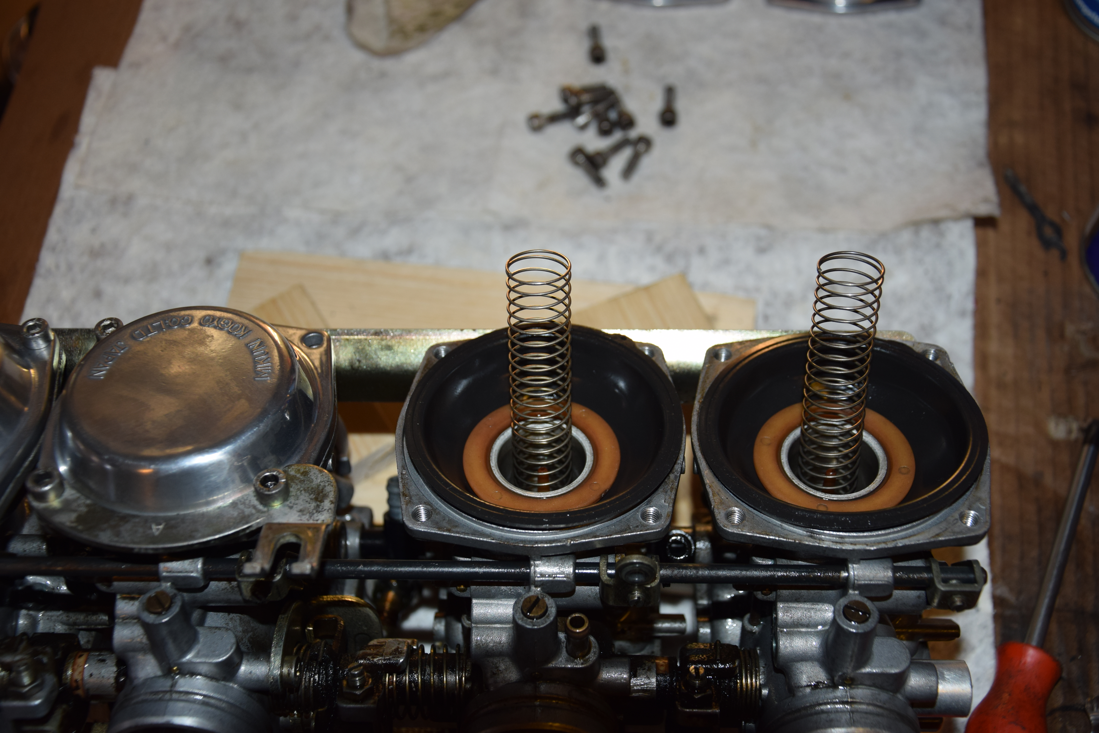 Anschließend kommen die Schieber mit den neuen Membranen von oben in die Vergaser, hier auch aufpassen das die Gummiwulst sauber in der Dichtnut im Vergaser liegt und nicht beim Auflegen des Deckels eingequetscht wird! - hier werden später noch die gewünschten Schrauben verwendet!