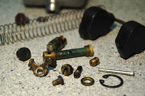 Membranen sind aber noch in Ordnung. Düsennadel ist allerdings total verharzt. Der Rest sicherlich auch. Also geht es jetzt an eine ausgiebige Reinigung des Vergasers.