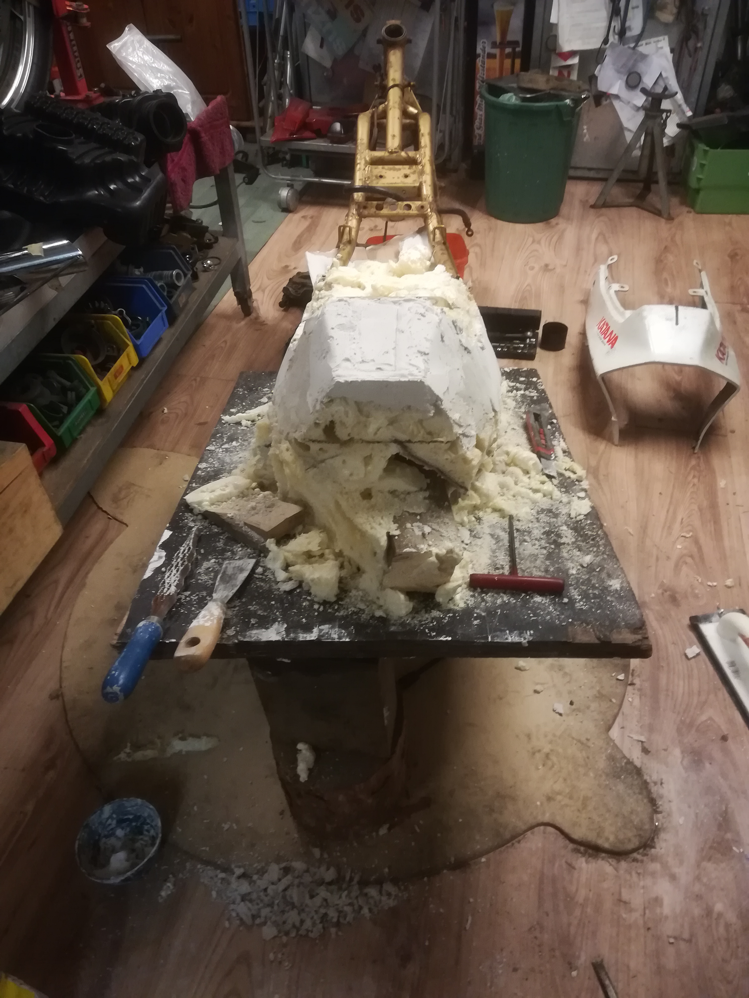 Es geht mit der Sitzbank weiter, da ja die Auspuffanlage unter dem Sitz laufen soll und die Originalität der der Verkleidung weitestgehend beibehalten wird, musste ich selbst Hand anlegen. Die Heckverkleidung auf den Blanko Rahmen verschraubt und zu geschäumt. Der Abdruck ist halbwegs in Ordnung, spachtel jetzt mit Gips nach
