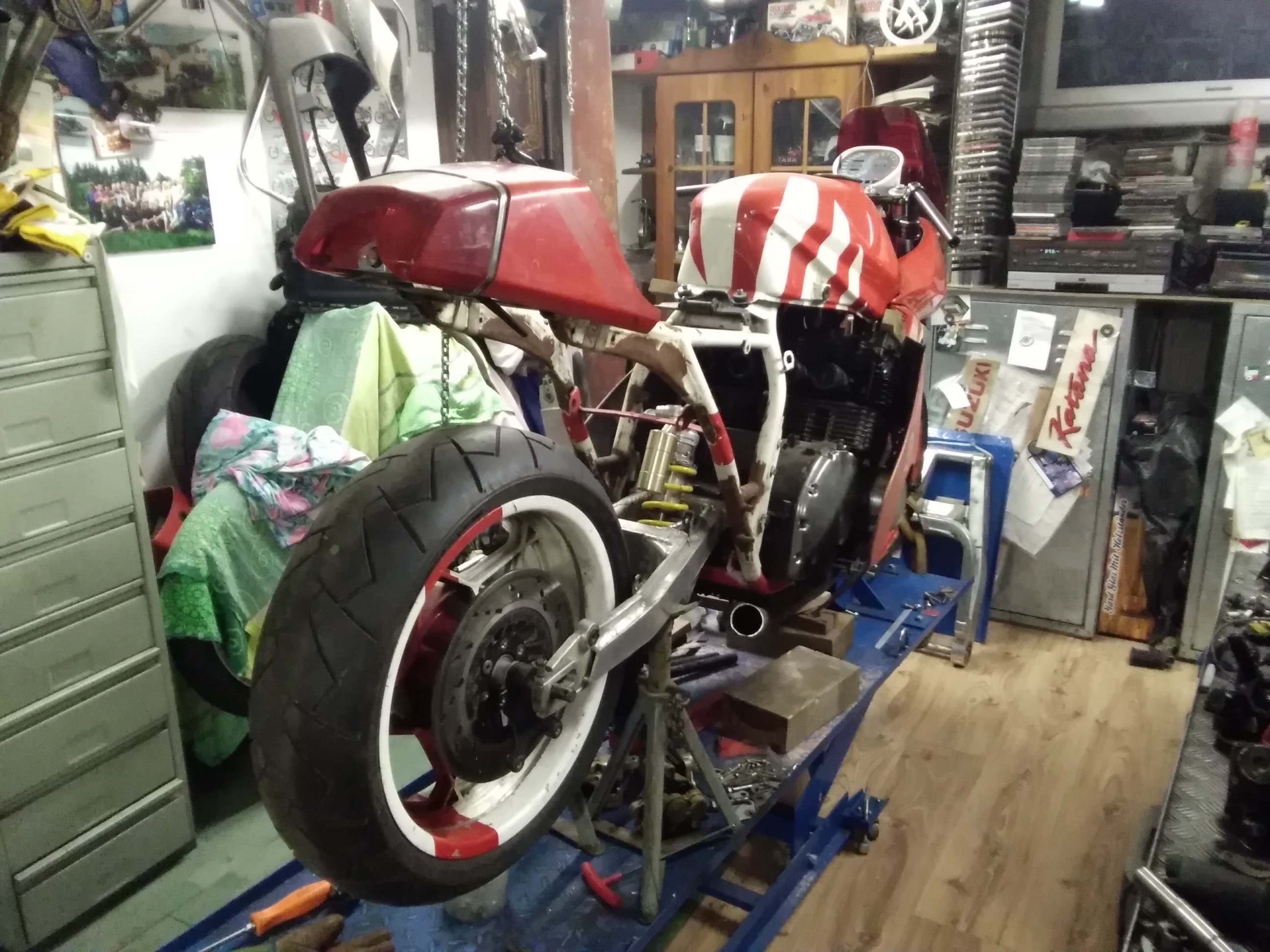 Ich weiß gar nicht, was die die sich bei Gimbel gedacht haben. Jetzt hatte ich schon gedacht, er wäre von einem anderen Modell. Steht aber 750 bzw 1100 Katana drinne. Na jedenfalls ist soweit ausgeartet, das ich die Endrohre abgetrennt habe, die Verkleidung halb zerstört habe, mit Holzkeile ausgerichtet habe, das es halbwegs passend ist. Im Endeffekt war ich bei meinem Seelentröster REWE, und hab erstmal Bier gekauft, um mich zu beruhigen. Und kann mir dann schon die nächste Idee. Ich wollte ja schon immer ein Wechselhöcker mit integrierter Sitzbank bauen. Und da die Flex schon draußen war, ran an den Rahmen. Fragt mich nicht über das ganze warum, weshalb wieso, ob ich Drogen nehme, wieviel und welche.was sagt der TÜV oder die Rennleitung. Wissenschaftliche Erklärung mit 4Buchstaben, " IS SO". na jedenfalls kann ich jetzt mit 2 Sitzbänken fahren, wechselseitig natürlich. Bin noch am überlegen, ob ich vielleicht noch noch Originale Sitzbank dazu nehme. So, hier die ersten Bilder
