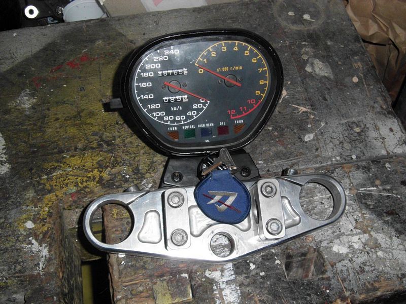 Gestern dann mal die Gabelbrücke montiert, den Lenker wieder befestigt und die Gabelrohre reingesteckt. Es sieht es wenigstens schon wieder fast so aus wie ein Motorrad