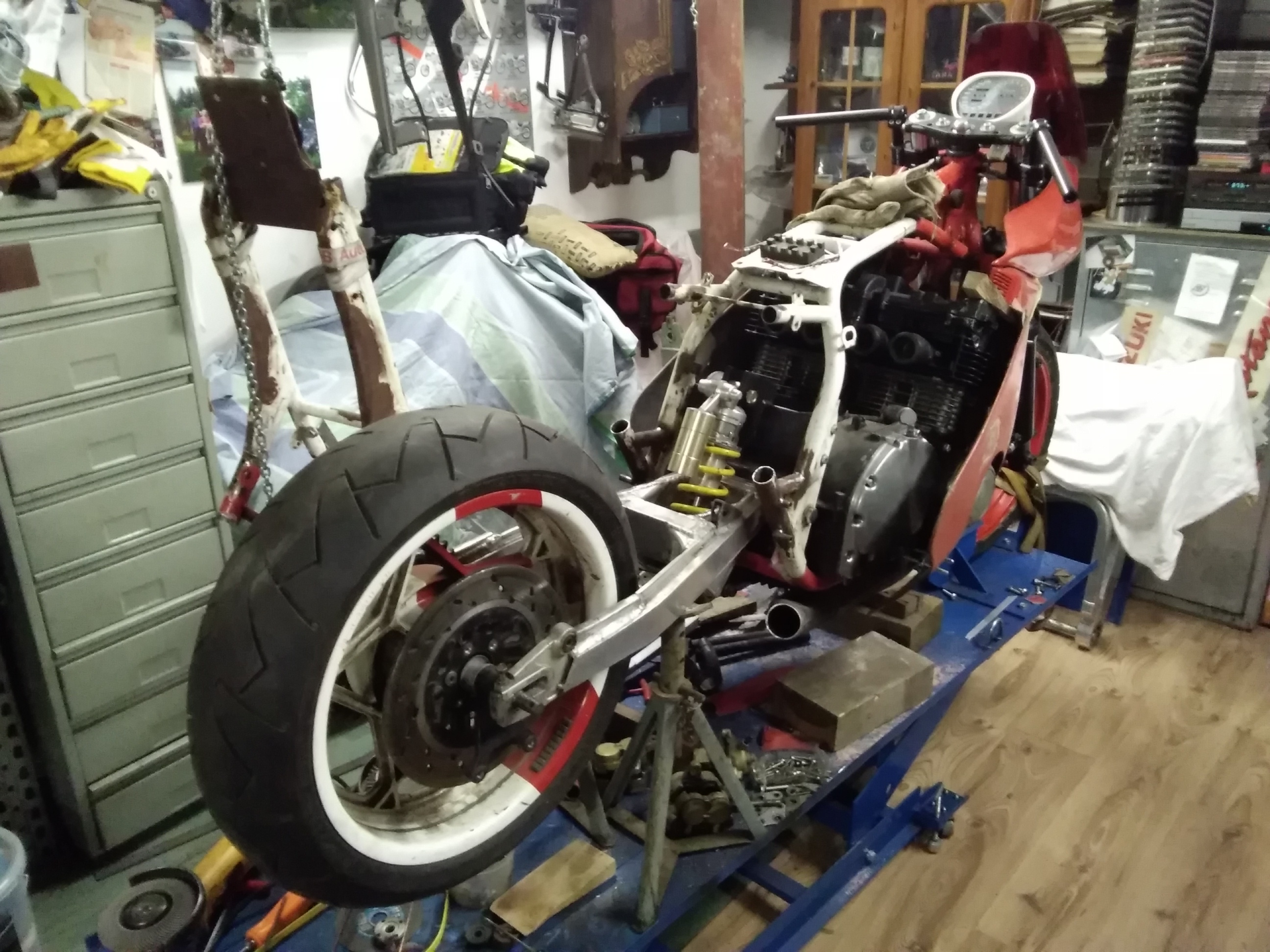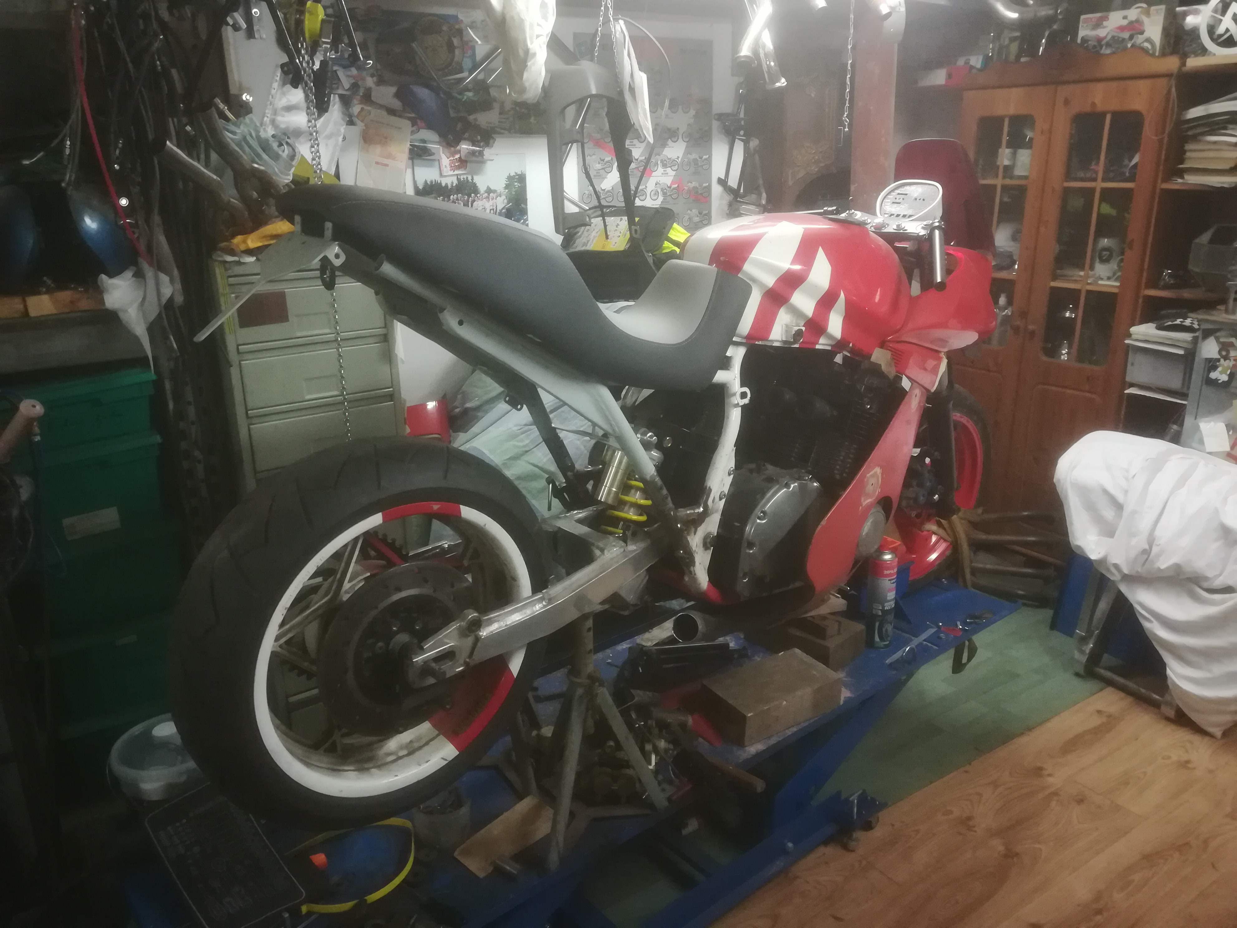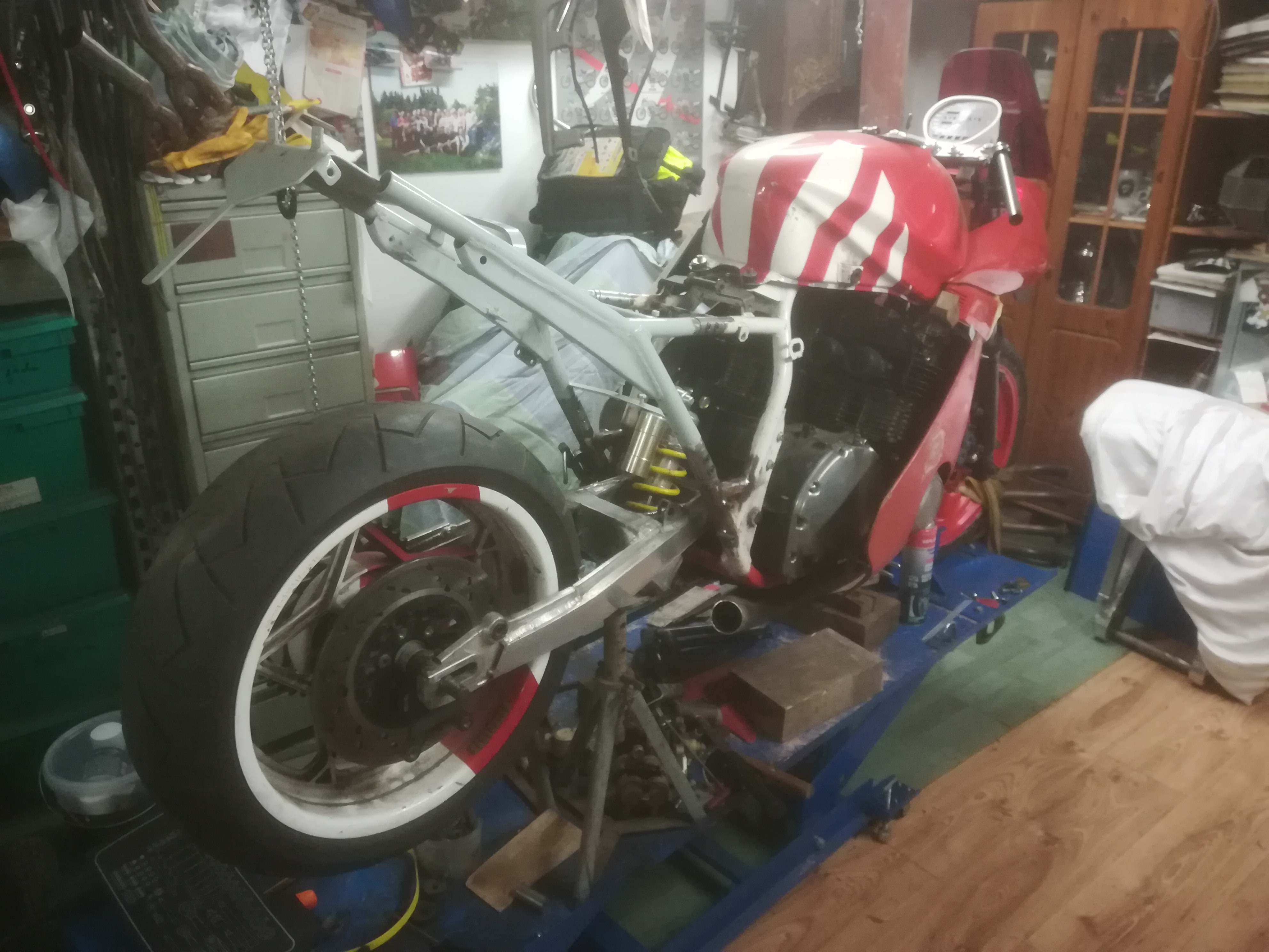 Trotz der vielen Arbeit ist mal etwas Zeit gewesen, um an der rot /weißen weiter zu bauen. Frontend steht, Telegabel von der Yamaha YZF 1000 R eingebaut, Bremsscheiben von der R1.. Passt hervorragend.