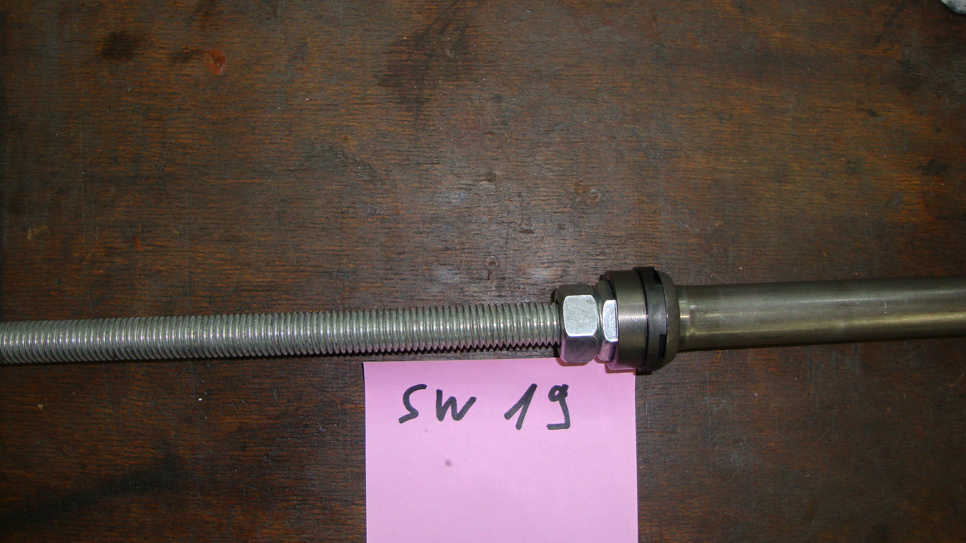Die Federgabel war für den Ahnungslosen, also mich, ein schlimmes Problem. Dämpferstange ließ sich nicht ausbauen, hat sich immer mitgedreht. Hab viel Zeit vorm Rechner verbracht und nichts Brauchbares gefunden. Außer die Nummer für ein Spezialwerkzeug zum Gegenhalten. Besenstiel zum Gegenhalten gehört ins Reich der Mythen und Märchen. Die Lösung ist ganz einfach: Gewindestange mit gekonterter Mutter ersetzt das Spezialwerkzeug.