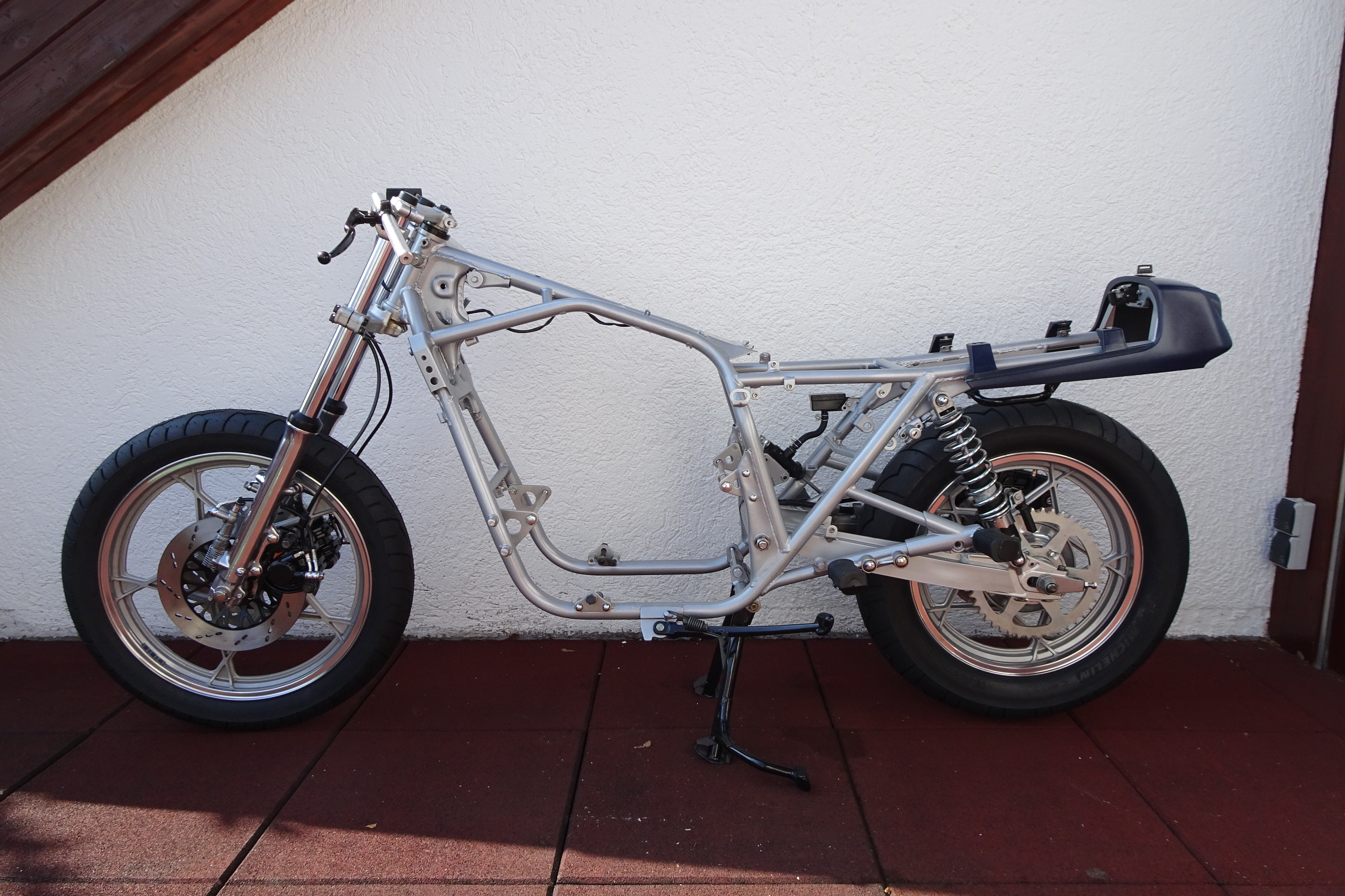 Also nun mal den Rahmen hübsch pulverbeschichten lassen. Das passende Katanasilber gab´s leider nicht, dafür ein etwas stärker reflektierendes. Glänzt wunderschön bei Sonnenschein. Den schönen Rahmen neben die Räder gestellt ergab zweifelsfrei: Auch die müssen lackiert werden. Unter dem Klarlack der Räder hatte sich Korrosion gebildet. Sah schlimm hässlich aus. Also erstmal ins Internet, schaun, wie man die Radlager rausbekommt. Werkzeug bestellt und rausklopfen. Auch die Räder erstmal pulverbeschichten. Spätestens jetzt hatte mich der Originalvirus befallen. Geld und Zeit spielen keine Rolle. Ob das Ding fährt, ist auch egal, Hauptsache original. Die Räder waren im Original lackiert, die Flanken aber geschliffen. Also hab ich die Flanken polieren lassen, um möglichst nahe an das Original zu kommen. Hab mich ein wenig geärgert, dass der Farbton nicht ganz dem Originalfarbton entspricht.
