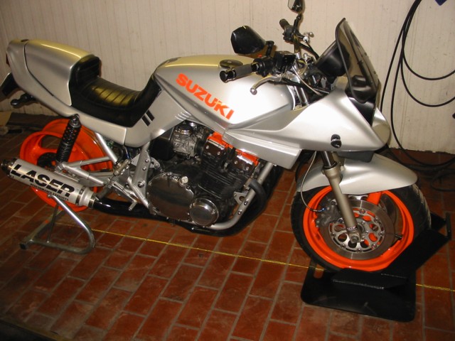GSX R Telegabel vorn (GV73C) mit Wilbers Federn, 17" GSX R Räder mit den dazugehörigen Bremsen vorn und hinten, das Speerheck soll beibehalten werden, Tarozzi Fußrastenanlage, Laser 4 in 1, kleinere Blinker, und wieder silber machen so sie original war.