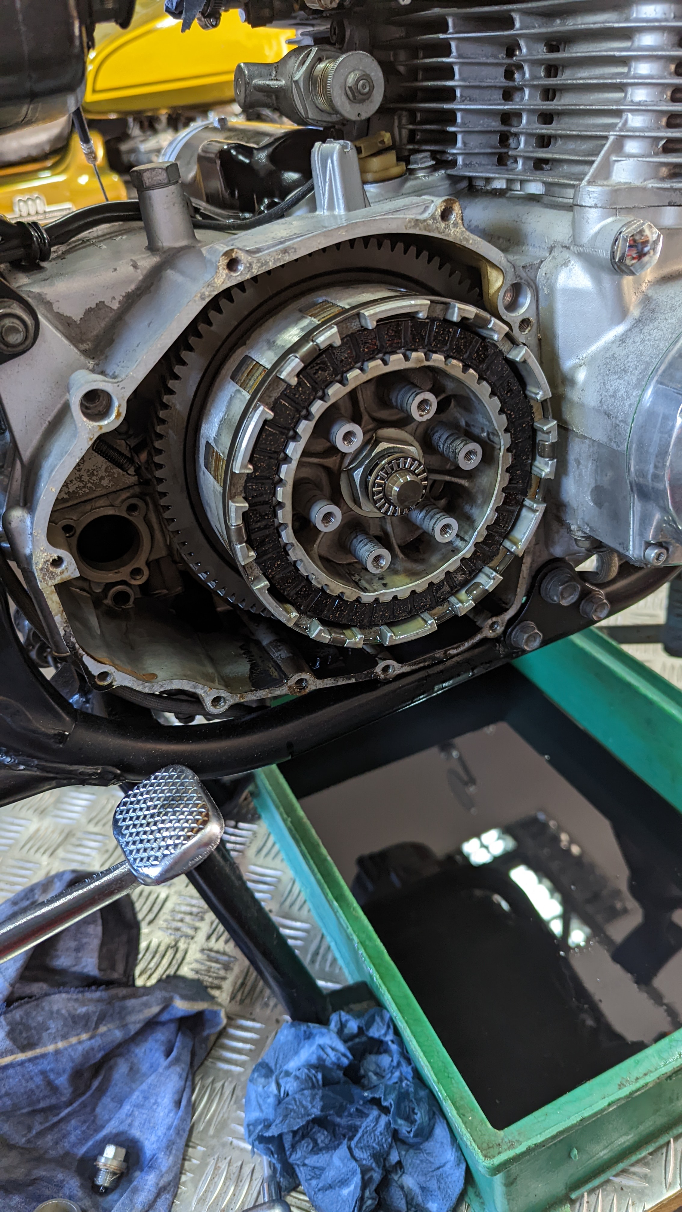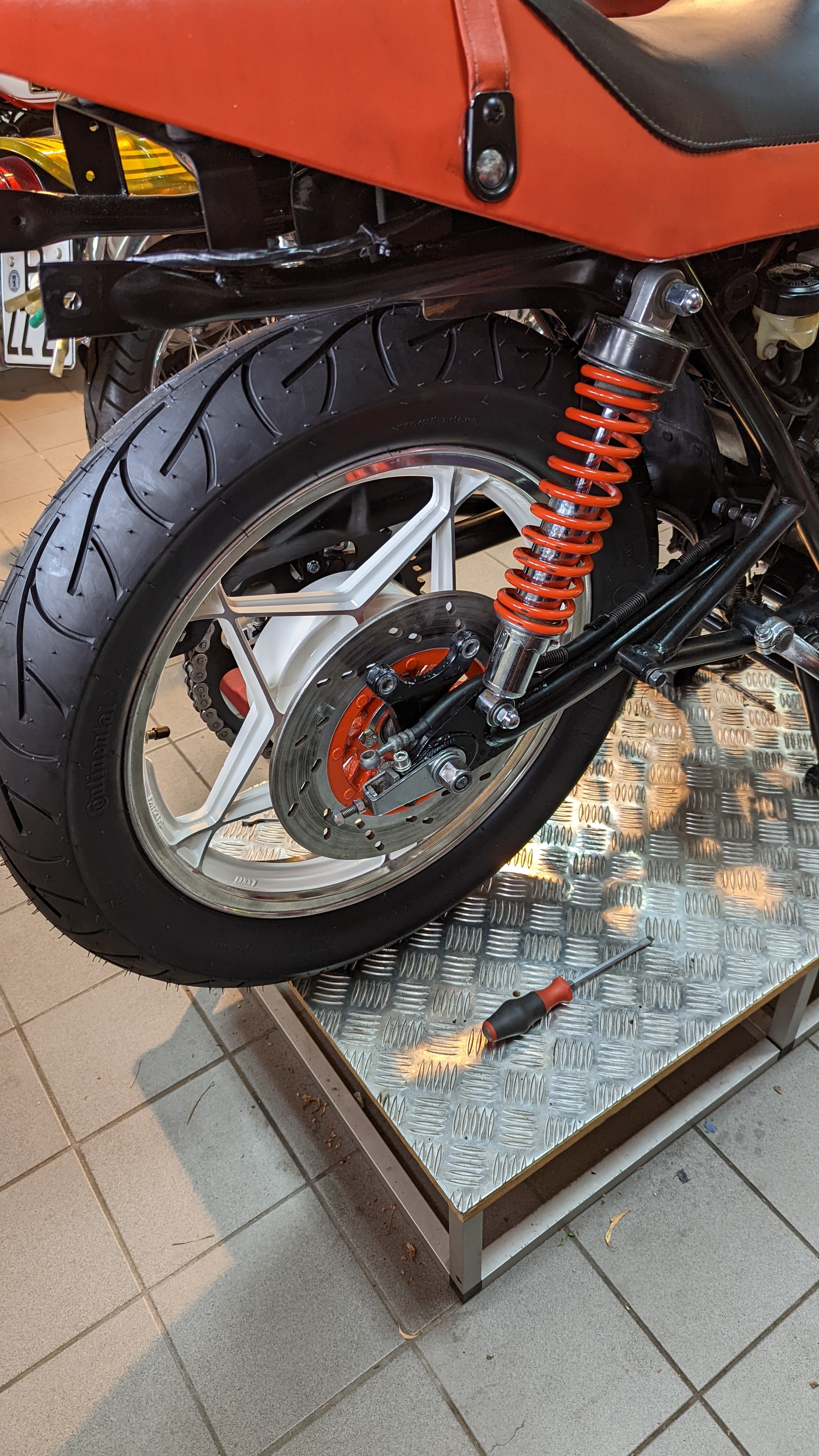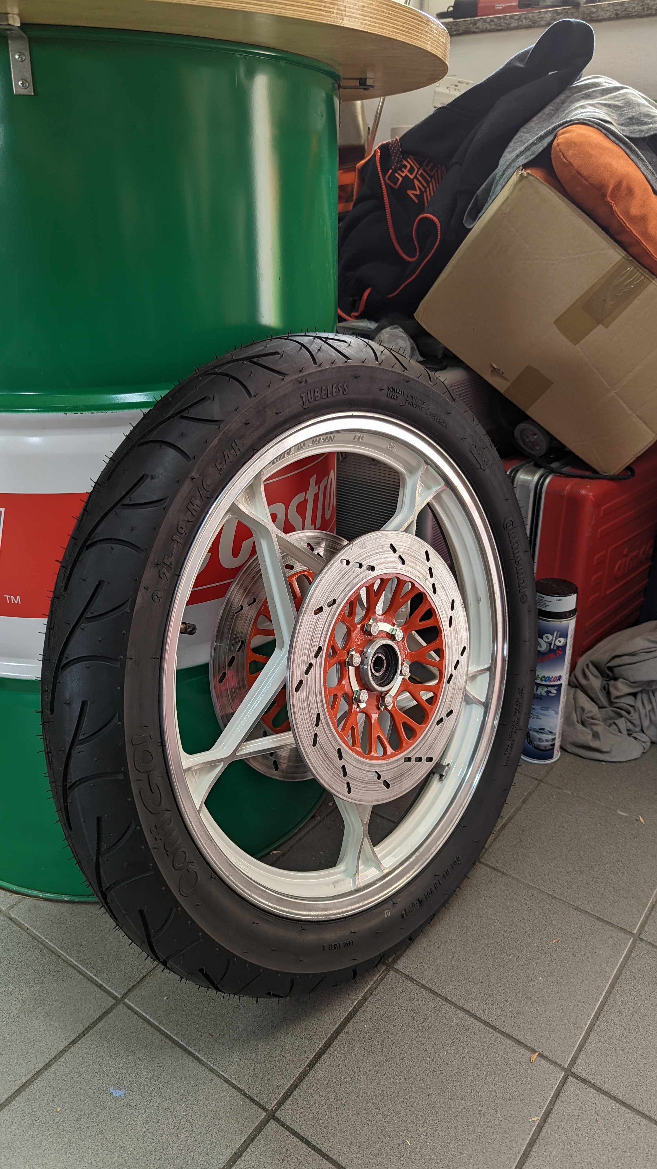 Es wurde schon die Heckpartie aufgearbeitet. Die Kupplung ist erneuert Am hinter und vorder Rad sind die Felgen und die Bremsanlage aufgearbeitet und neu lackiert und es sind neue Reifen aufgezogen Sämtliche Lackteile wie Tank, Heck und Seitenteile sind schon beim Lackierer.