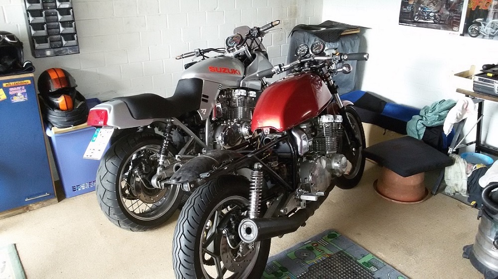 Hallo ,hier mal ein aktuelles Bild meiner beiden Suzi Geschwister. Die Katana hat aktuell einen neuen Lenker u. das orig. Rücklicht.Baustellen in Moment beendet ! Mit der Kat gehts im Mai nach Österreich.