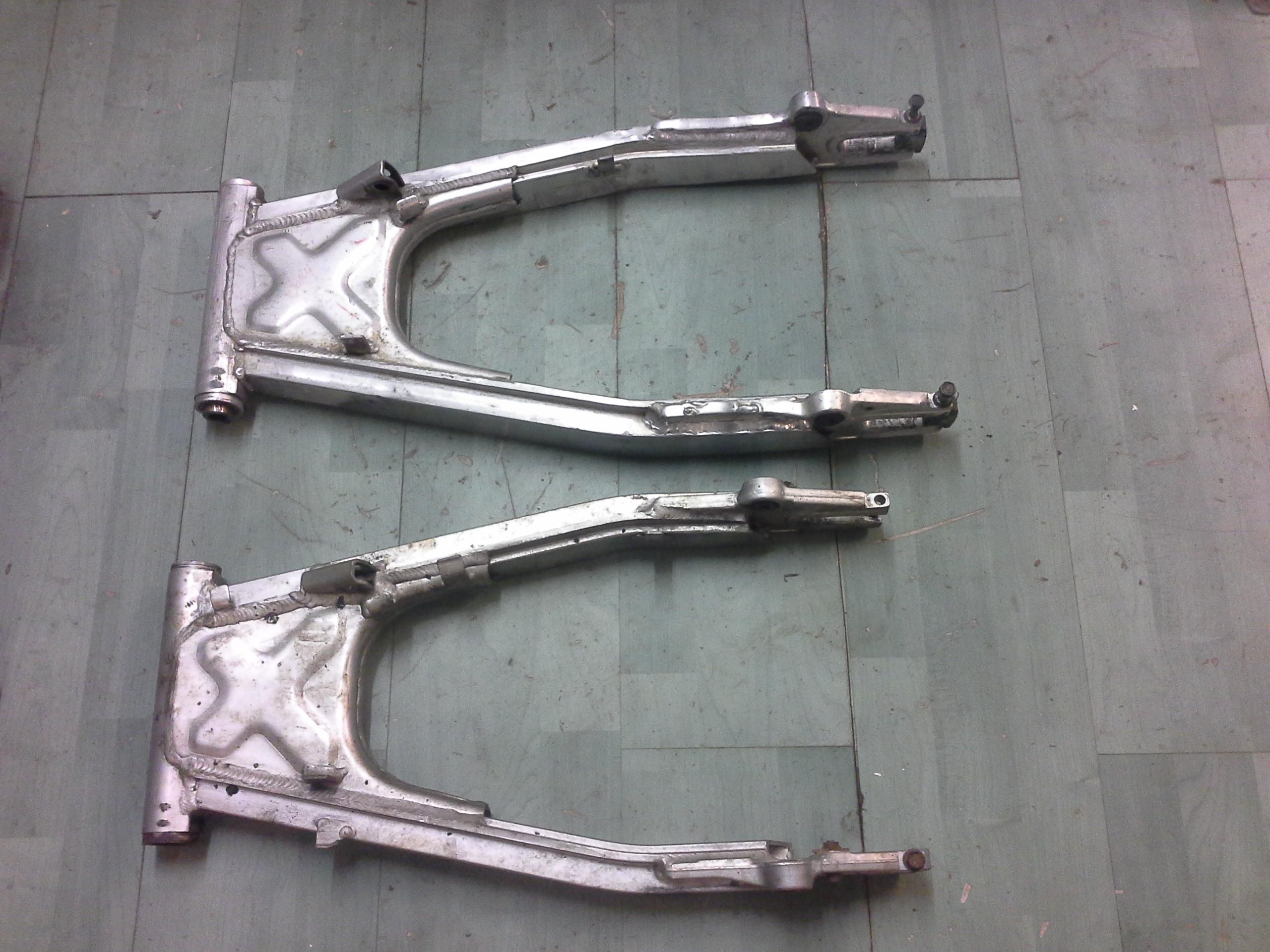 Hier noch mal ein paar Bilder. Die Originale, die verlängerte Originale und die R-Schwinge, die ich zerschneiden werde und das Federsystem in die Verlängerte integrieren will