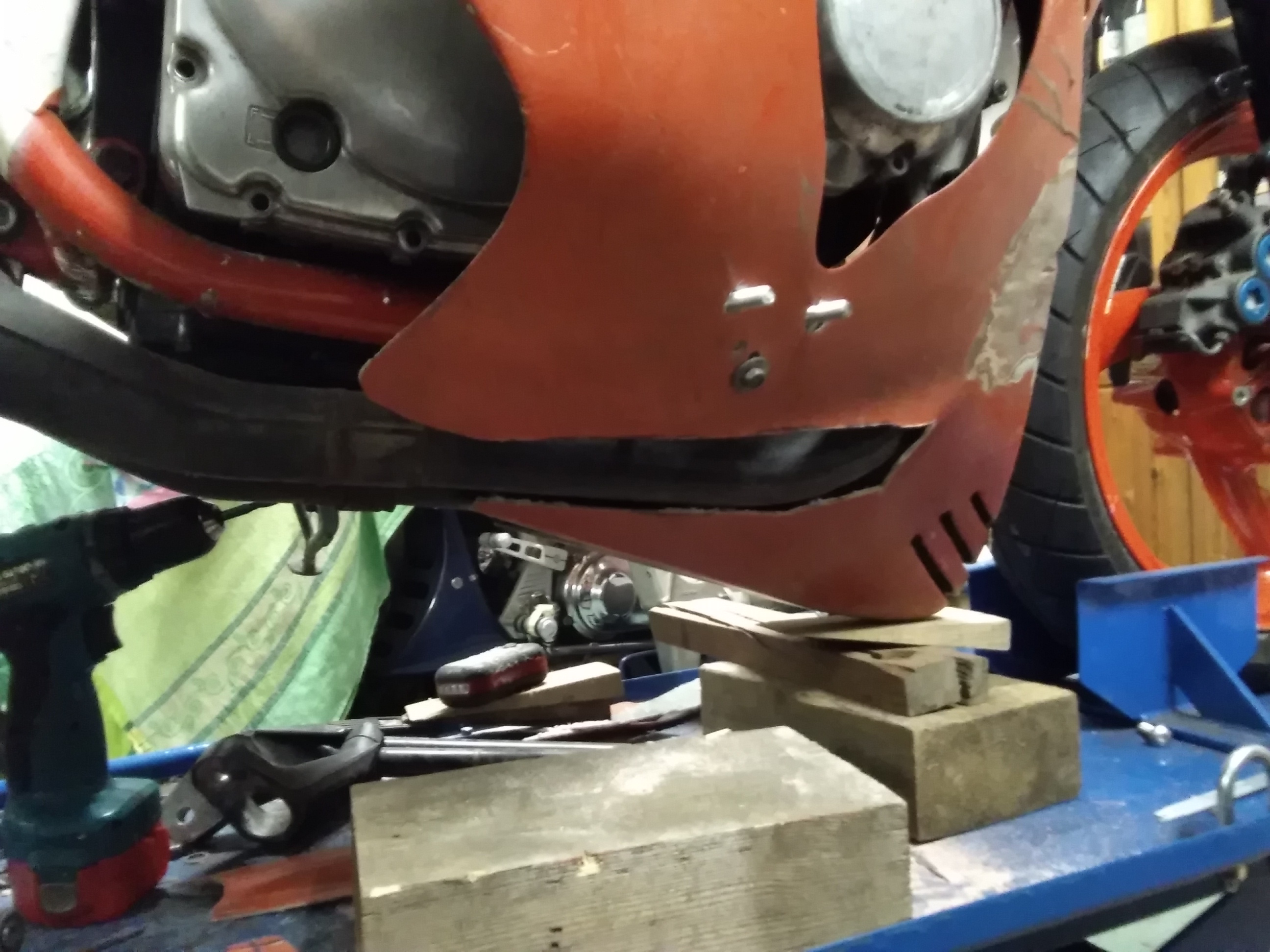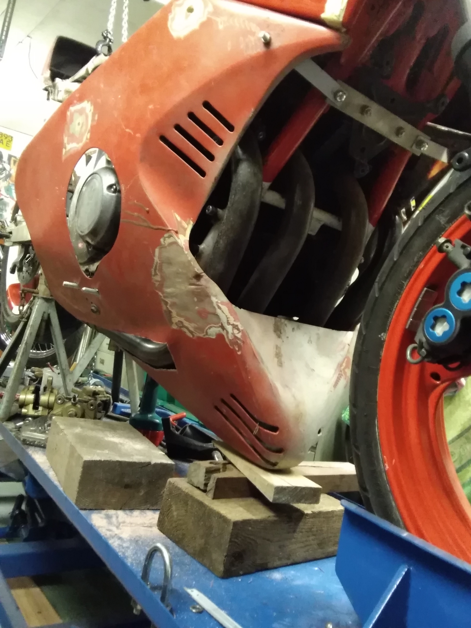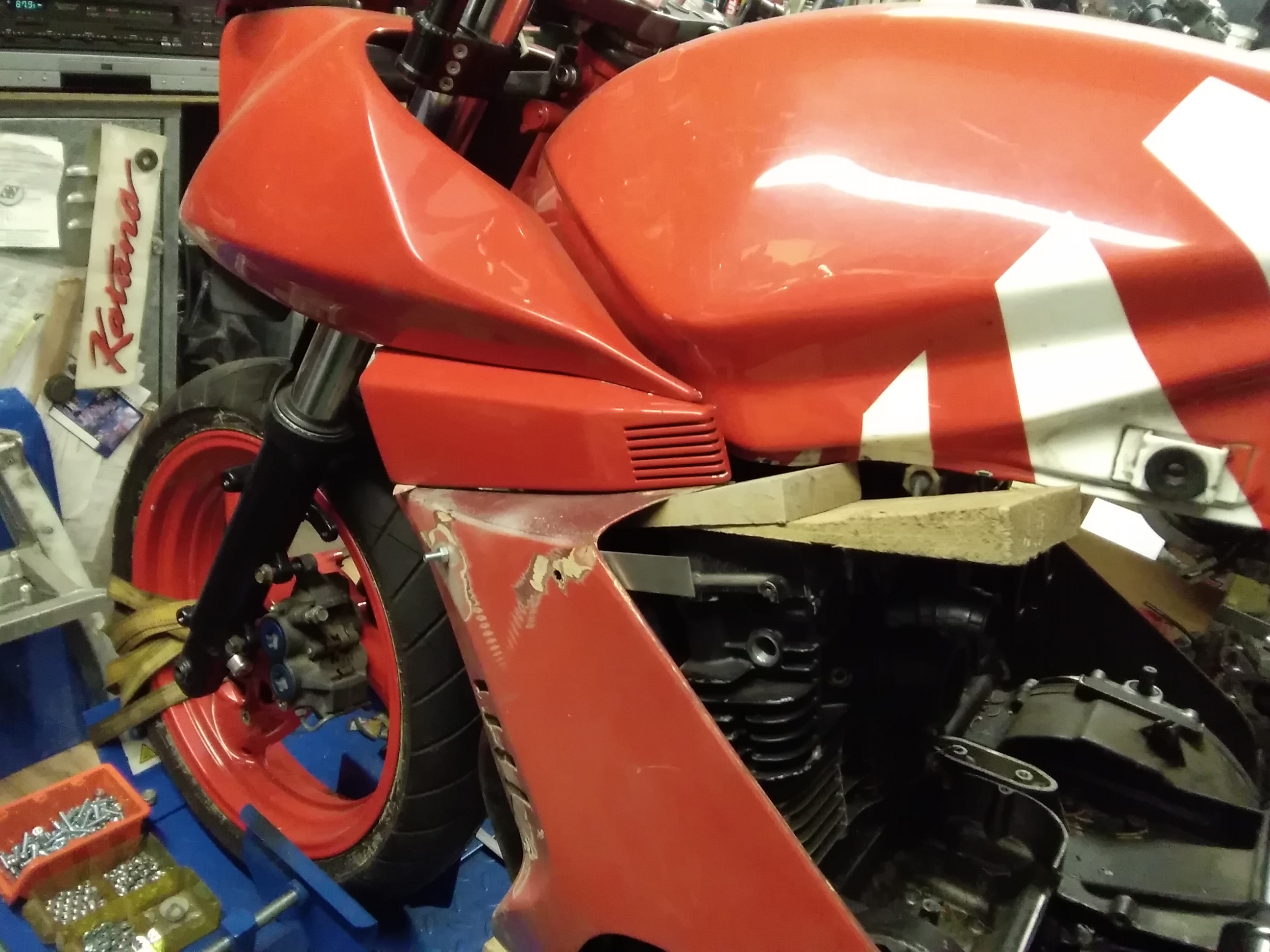 Jetzt komm ich mal zu meinem Sorgenkind Nr 1. Einige werden sich noch an meine ro/we Kati erinnern. Steht ja jetzt auch schon 3-4 Jahre auf der Rampe. Nun ging es weiter. Gabel von der Yamaha YZF 1000 R mit Vorderradfelge, fehlen nur die Bremsscheiben, Sättel sind von der R1. Dann hab ich endlich den Spoiler von Gimbel gekauft. So, ranhalten und festschrauben. Nix da, passt vorn und hinten nicht. Ständig war mein Edelstahlkrümmer im Weg. Okay, Krümmer ab und Originalen angeschraubt. Nächstes Problem, um dn Spoiler zu montieren, muss man das Motorrad ein halber Meter in die Luft heben, um das Dingen zu zu kriegen. ALPTRAUM