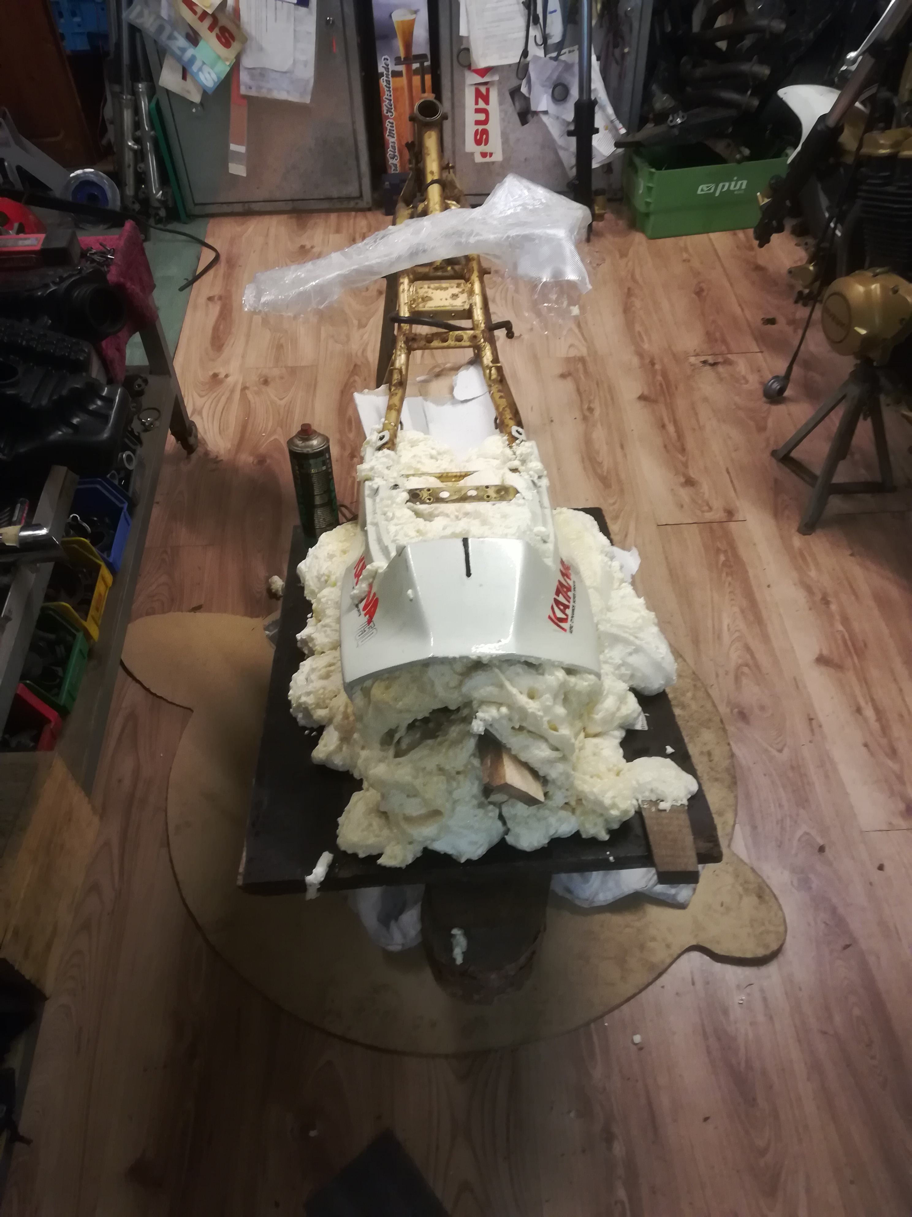 Es geht mit der Sitzbank weiter, da ja die Auspuffanlage unter dem Sitz laufen soll und die Originalität der der Verkleidung weitestgehend beibehalten wird, musste ich selbst Hand anlegen. Die Heckverkleidung auf den Blanko Rahmen verschraubt und zu geschäumt. Der Abdruck ist halbwegs in Ordnung, spachtel jetzt mit Gips nach