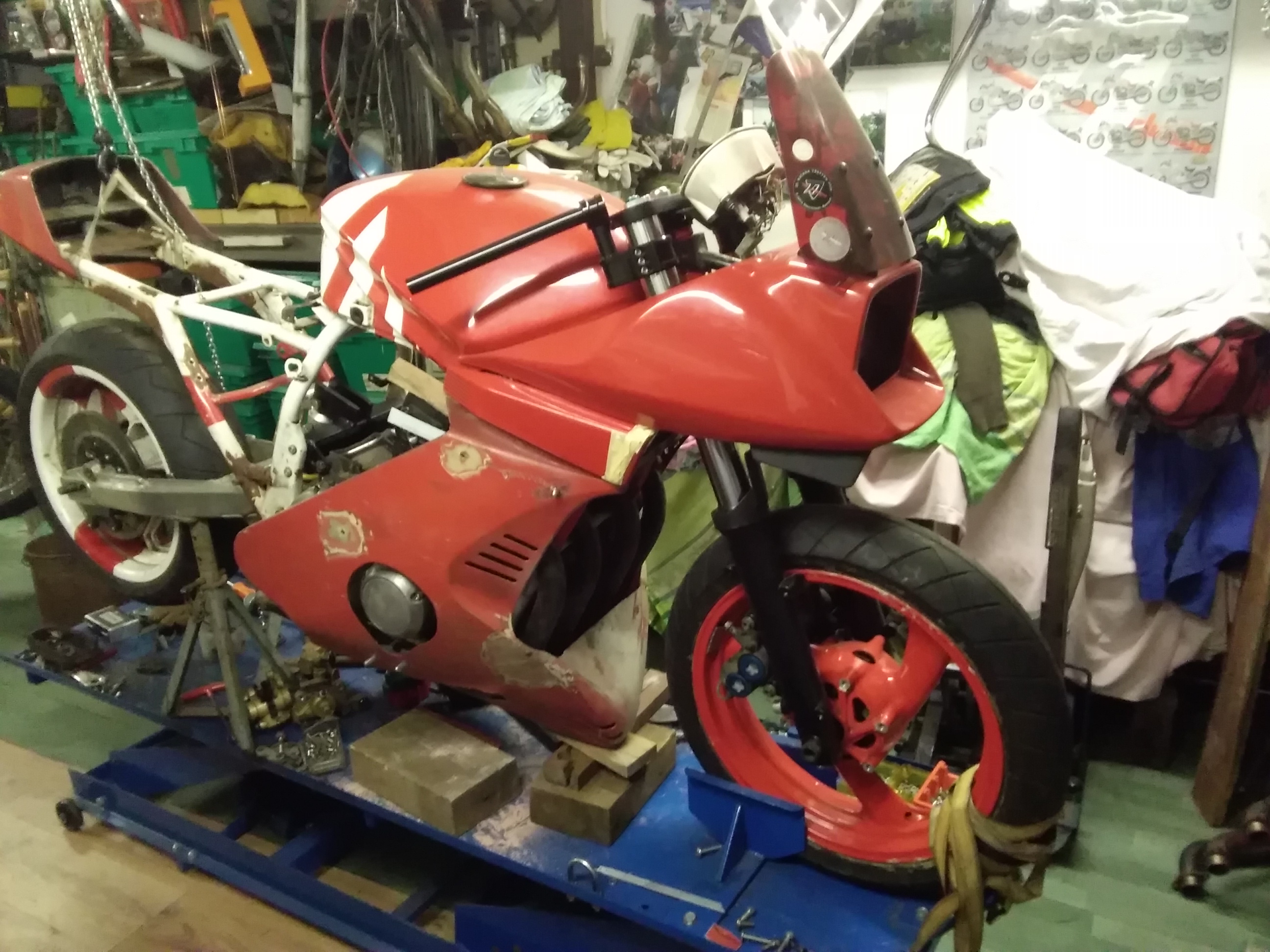 Jetzt komm ich mal zu meinem Sorgenkind Nr 1. Einige werden sich noch an meine ro/we Kati erinnern. Steht ja jetzt auch schon 3-4 Jahre auf der Rampe. Nun ging es weiter. Gabel von der Yamaha YZF 1000 R mit Vorderradfelge, fehlen nur die Bremsscheiben, Sättel sind von der R1. Dann hab ich endlich den Spoiler von Gimbel gekauft. So, ranhalten und festschrauben. Nix da, passt vorn und hinten nicht. Ständig war mein Edelstahlkrümmer im Weg. Okay, Krümmer ab und Originalen angeschraubt. Nächstes Problem, um dn Spoiler zu montieren, muss man das Motorrad ein halber Meter in die Luft heben, um das Dingen zu zu kriegen. ALPTRAUM