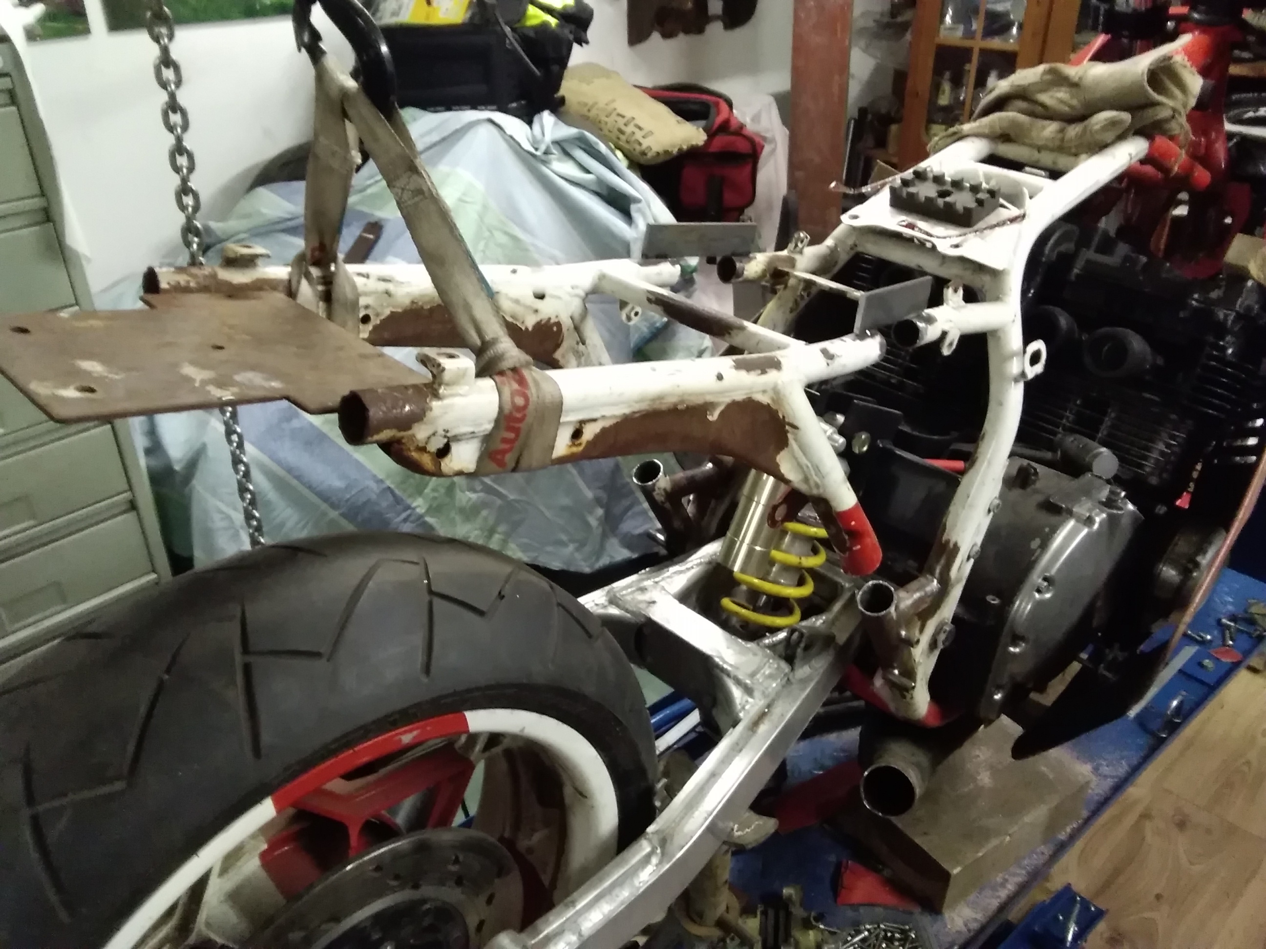 Trotz der vielen Arbeit ist mal etwas Zeit gewesen, um an der rot /weißen weiter zu bauen. Frontend steht, Telegabel von der Yamaha YZF 1000 R eingebaut, Bremsscheiben von der R1.. Passt hervorragend.