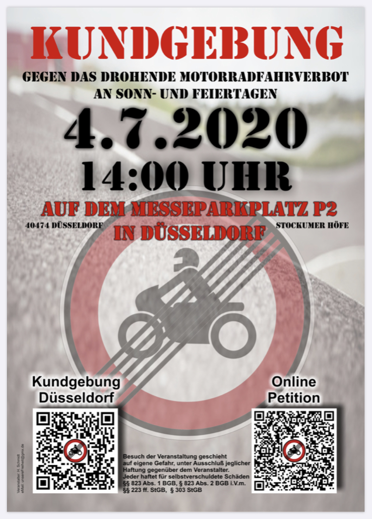 Nächsten Samstag wird in Düsseldorf eine Demo veranstaltet, um gegen mögliche Fahrverbote für Motorräder an Wochenenden und Feiertagen Flagge zu zeigen.