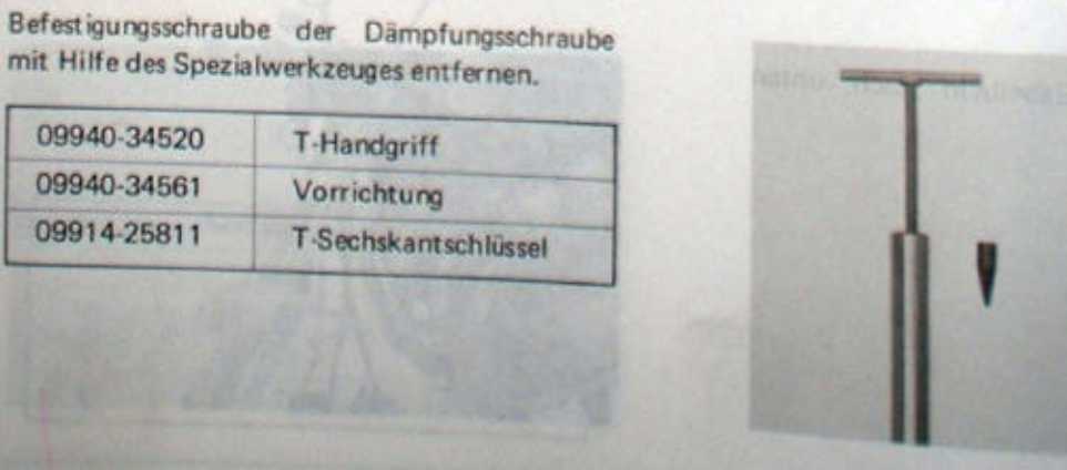 Folgendes Problem: Um das Tauchrohr aus dem Standrohr zu demontieren brauch man lt. WHB ein "spezial" T-Handgriff und einen T-Sechskantschlüssel für die untere 8mm Innensechskant-Schraube. Wie ist der T-Handgriff aufgebaut? Ist das ein Nuß-Kopf oder auch ein Inbus? Und was für eine Größe? Gibt es Alternativen (selbstbau)? Kann im Inneren leider nicht richtig erkennen was es ist :? . Die Suche hat leider nichts ergeben :cry:
