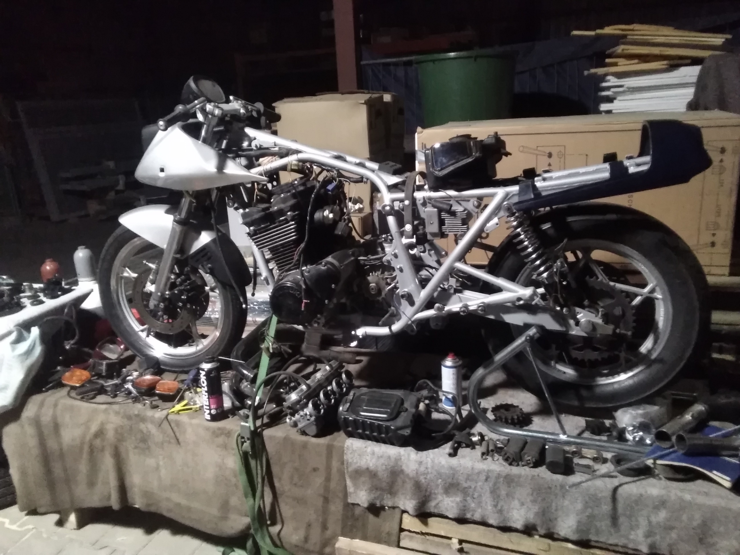 Es geht voran. Bin dabei, eine 11er Originale für mich bauen. Leider musste ich erstmal den EF Motor rein hängen, weil der 11er Originale noch auf der Werkbank liegt. Bis zum DT - Treffen soll sie jedenfalls fertig sein. Aber es ist schon komisch, sie ist noch nicht ansatzweise fertig, und schon denke ich über dicke Speichenräder, anderen Auspuff nach