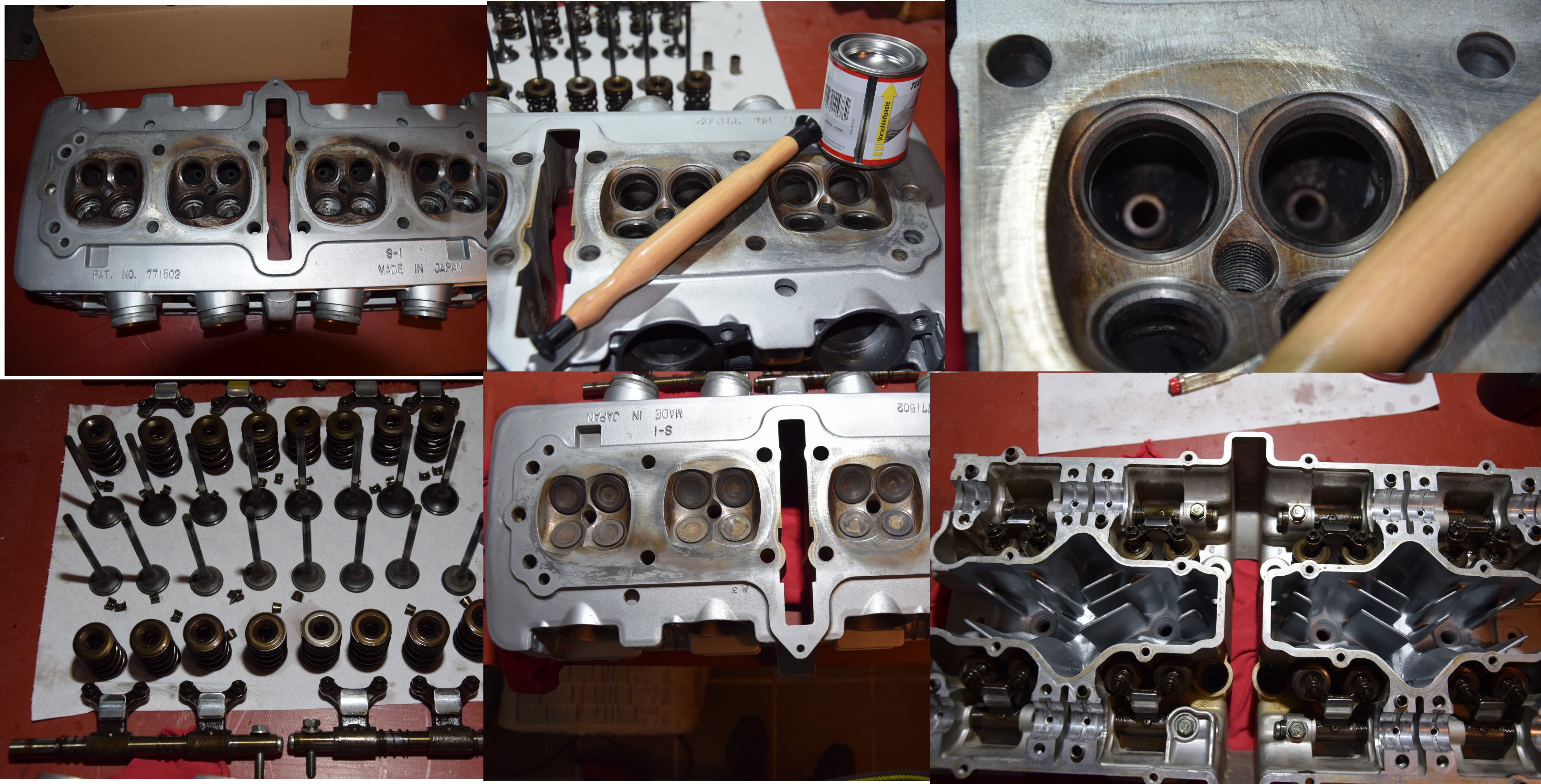 hab erst einmal die Produktionsmängel im Einlasstrakt beseitigt, die Einlasskanäle sind oftmals Asymmetrisch ausgearbeitet, gut zu erkennen auf dem Bild oben links von einem Vergleichszylinderkopf. Es wird bei aufgesteckten Ansauggummi deutlich erkennbar, wie der Ansaugkanal in den Luftstrom ragt und diesen negativ beeinträchtigt! Unten rechts der Überarbeitete Kanal. Dann habe ich die Ventile gereinigt und diese an den Sitzen neu eingeschliffen, und anschließend den Zylinderkopf wieder komplett zusammengebaut. Jetzt warte ich noch auf die Zylinderbank, die wird auf das erste Übermaß aufgebohrt und mit neuen Kolben bestückt.