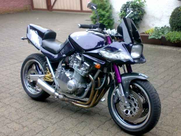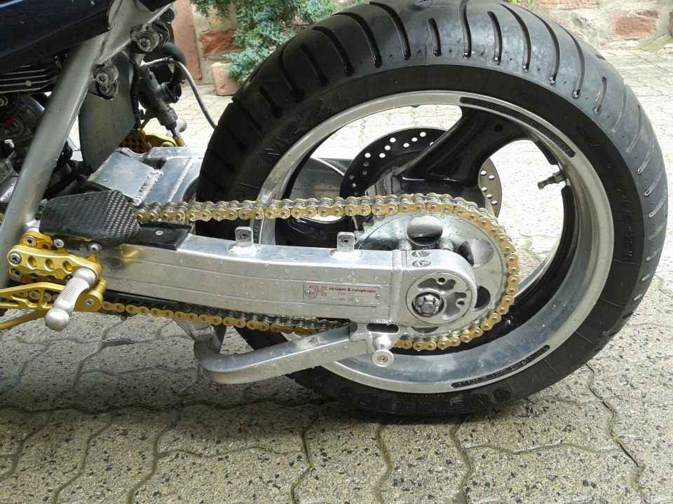 Heck: Monofederbeinumbau (ausgführt vor ca. 10 Jahren von Werner Katana Nürnberg) aktuell mit K&J und 5,5 Zoll GSXR felge mit 180er.