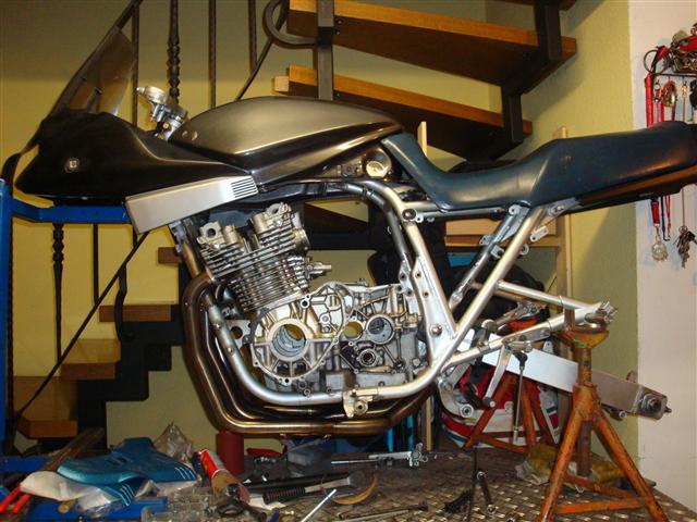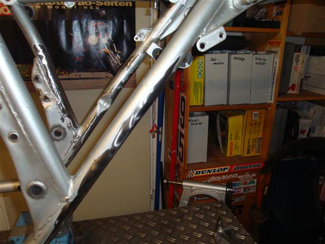Wenn man sich vor Augen führt, wie massig dieses Ding an zentraler Stelle des Rahmens sitzt, wird klar, warum das einen so stabilisierenden Einfluß auf das Fahrwerk hat, wie ich weiter vorne schon mal gesagt hatte.