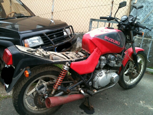 Ich wohne im Raum Erlangen (Mittelfranken) bin 48, verheiratet. Habe meinen Schein erst mit 30 Jahren (auf Anraten meiner Frau :D ) gemacht und habe mir, mit Freigabe des 1ers eine GS 650 G Katana in schwarz/rot gekauft. Die habe ich ganzjährig gefahren und, zu meiner Schande, nie gepflegt. Seit 7 Jahren steht sie jetzt draußen und modert vor sich hin. Nachdem ich jetzt meiner Frau ihre 750er Zephyr (für die "Jungspunde" ;) , das ist ne Kawa) nach 13 Jahren Standzeit in der Garage wieder erfolgreich reaktiviert habe, bin ich jetzt an das Großprojekt Katana gegangen und habe sie komplett zerlegt. Rahmen, Felgen, Schwinge und diverse andere Blechteile werde ich demnächst zum Strahler bringen und danach Kunststoffbeschichten. Der Auspuff wurde bereits vor 7 Jahren von einem Bekannten geschweißßt. Allerdings hat er dabei den Asupuff fest an die Krümmer angeschweißt :( . Den werde ich noch strahlen und schwarz lackieren. Den Motor und Vergaser wollte ich eigentlich entweder Glasperlen- oder Trockeneisstrahlen lassen. Die Arbeiten von jogy67 und Welli sind schon sehr geil anzusehen :D