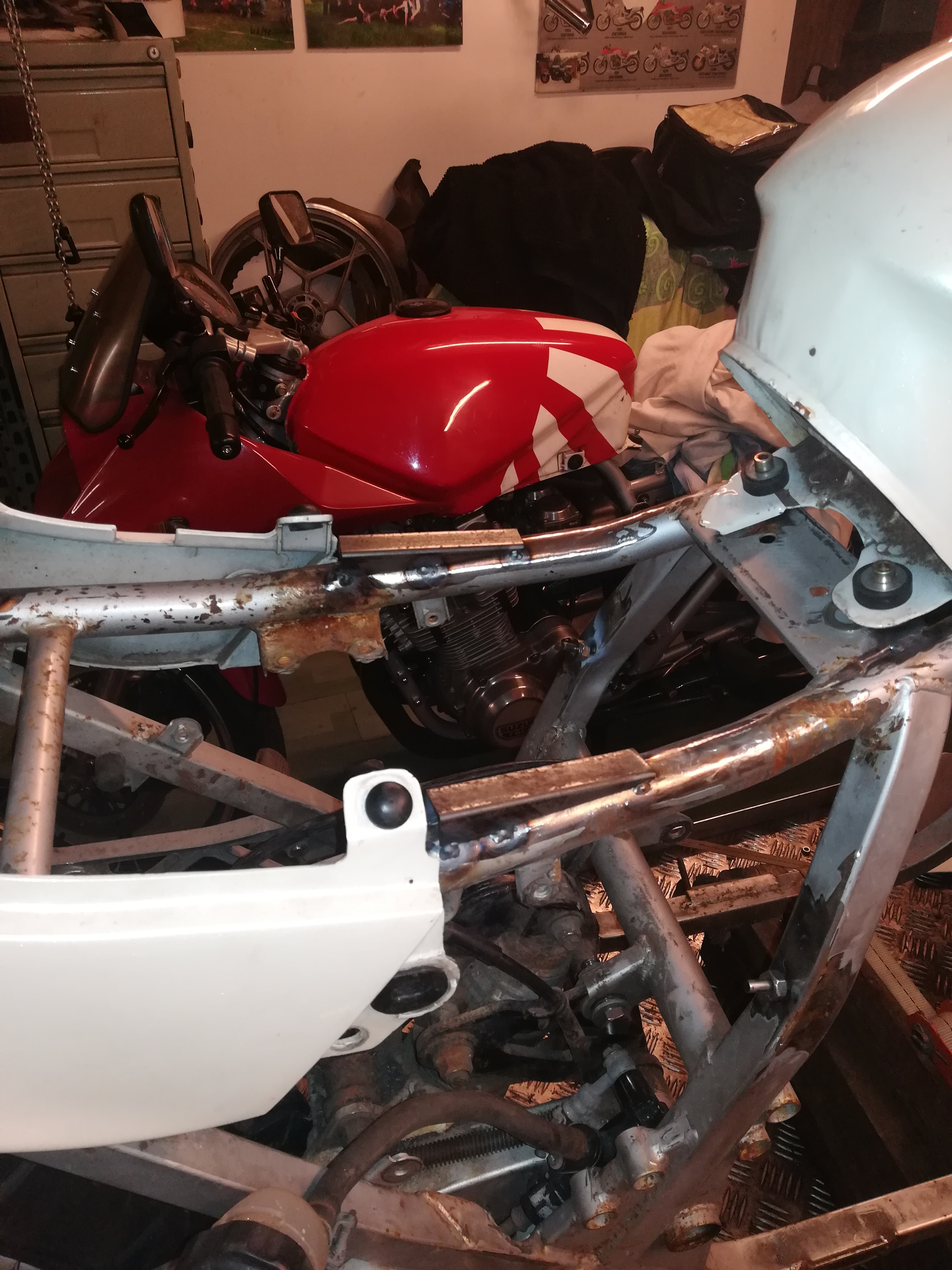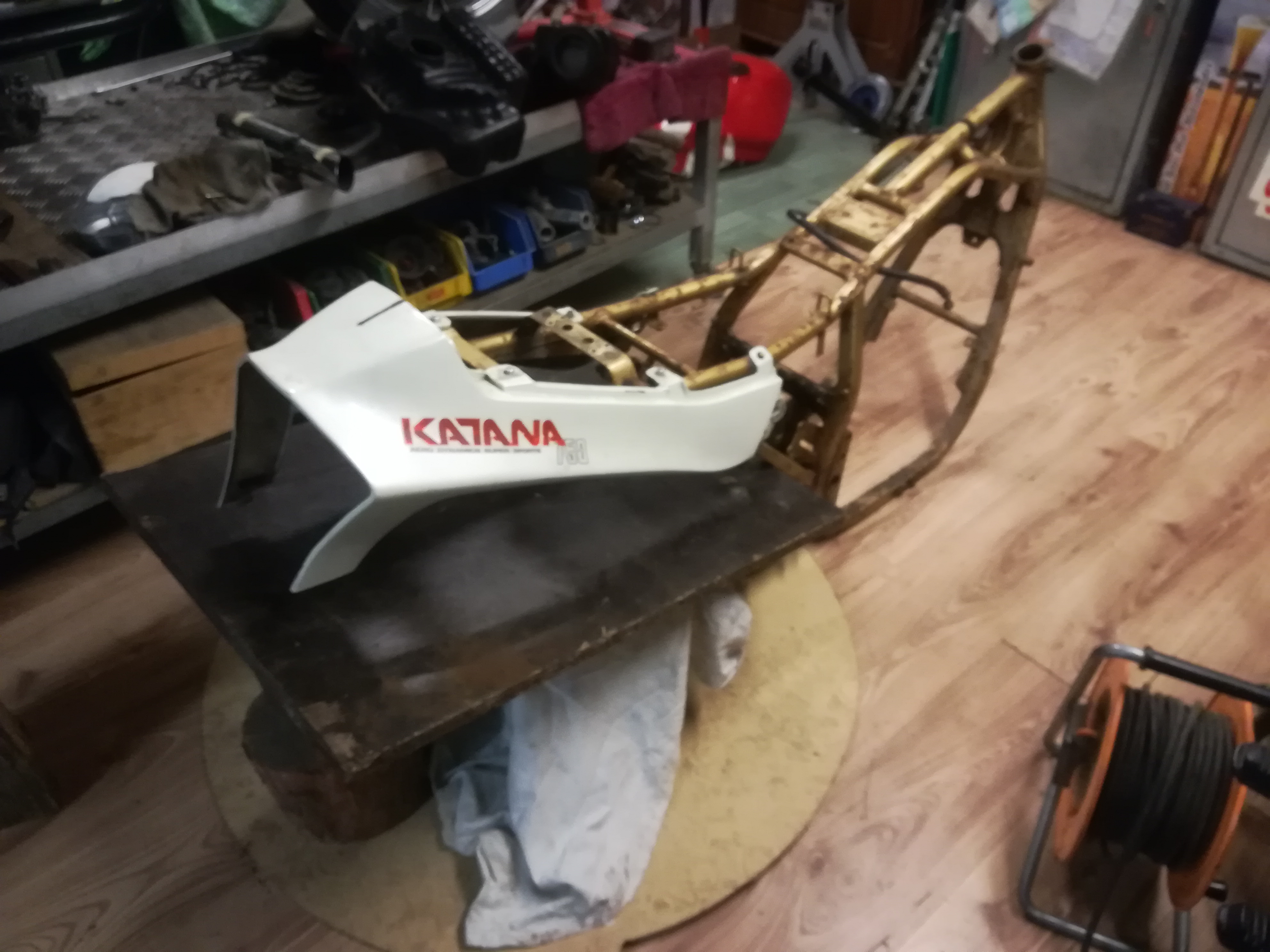 Ich weiß gar nicht, was die die sich bei Gimbel gedacht haben. Jetzt hatte ich schon gedacht, er wäre von einem anderen Modell. Steht aber 750 bzw 1100 Katana drinne. Na jedenfalls ist soweit ausgeartet, das ich die Endrohre abgetrennt habe, die Verkleidung halb zerstört habe, mit Holzkeile ausgerichtet habe, das es halbwegs passend ist. Im Endeffekt war ich bei meinem Seelentröster REWE, und hab erstmal Bier gekauft, um mich zu beruhigen. Und kann mir dann schon die nächste Idee. Ich wollte ja schon immer ein Wechselhöcker mit integrierter Sitzbank bauen. Und da die Flex schon draußen war, ran an den Rahmen. Fragt mich nicht über das ganze warum, weshalb wieso, ob ich Drogen nehme, wieviel und welche.was sagt der TÜV oder die Rennleitung. Wissenschaftliche Erklärung mit 4Buchstaben, " IS SO". na jedenfalls kann ich jetzt mit 2 Sitzbänken fahren, wechselseitig natürlich. Bin noch am überlegen, ob ich vielleicht noch noch Originale Sitzbank dazu nehme. So, hier die ersten Bilder