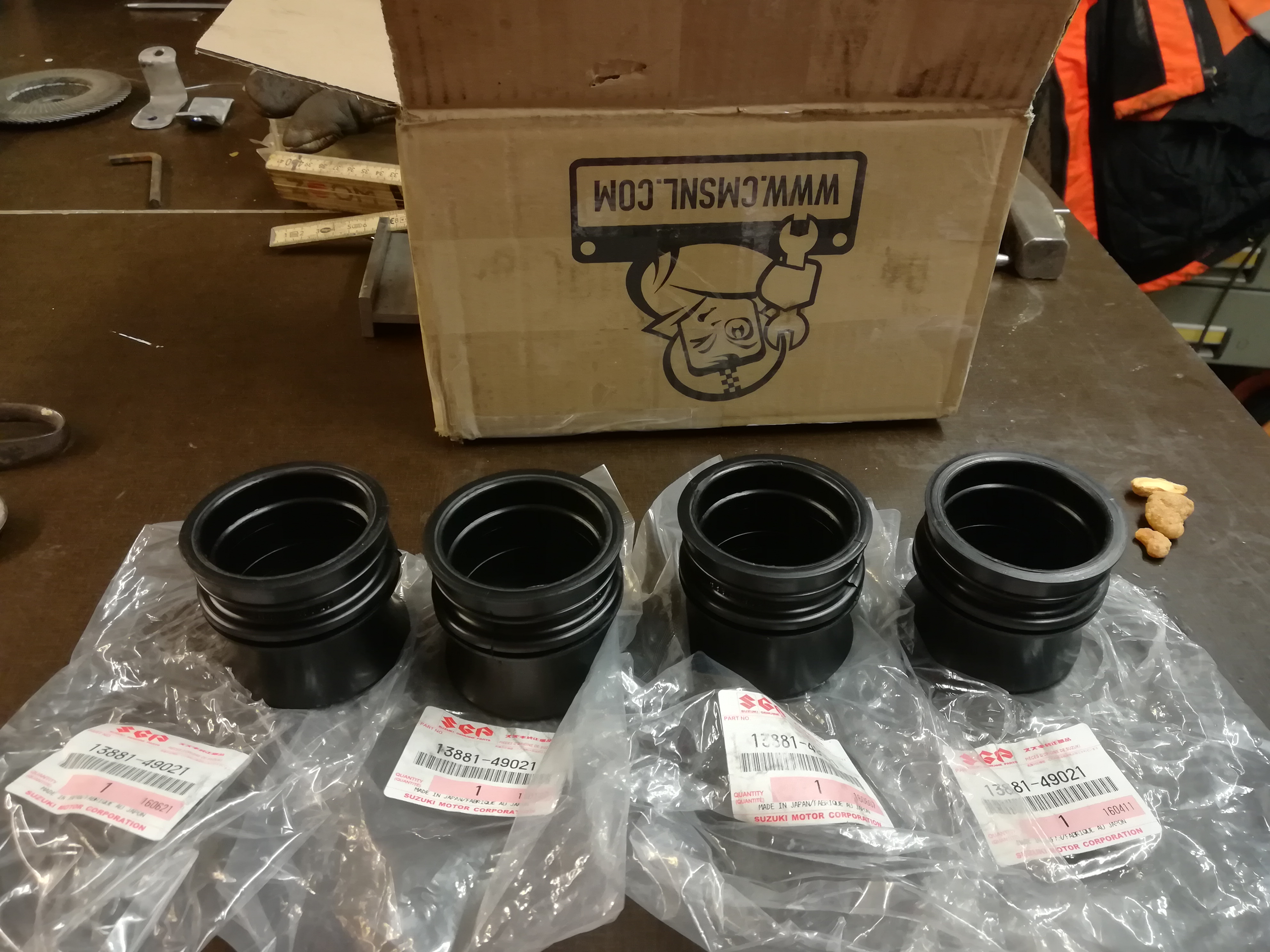 750iger Originale, endlich sind Gummis für den Luftfilterkasten gekommen. Also die alten Gummis aus dem Kasten befreien, ich musste sie tatsächlich noch mal warm machen, um sie ausbauen. Federringe raus, die Alten entsorgt und die Neuen rein. Traumhaft was neue Gummis ausmachen. Luftfilterkasten in Rahmen, Vergaser flutscht rein. Bo-ey! Kein Geschrei und Gezeter, Fluchen fällt aus, der Nachbar holt keine Polizei, wegen ruhestörenden Lärm und in Brauerei brauch ich auch nicht anrufen.