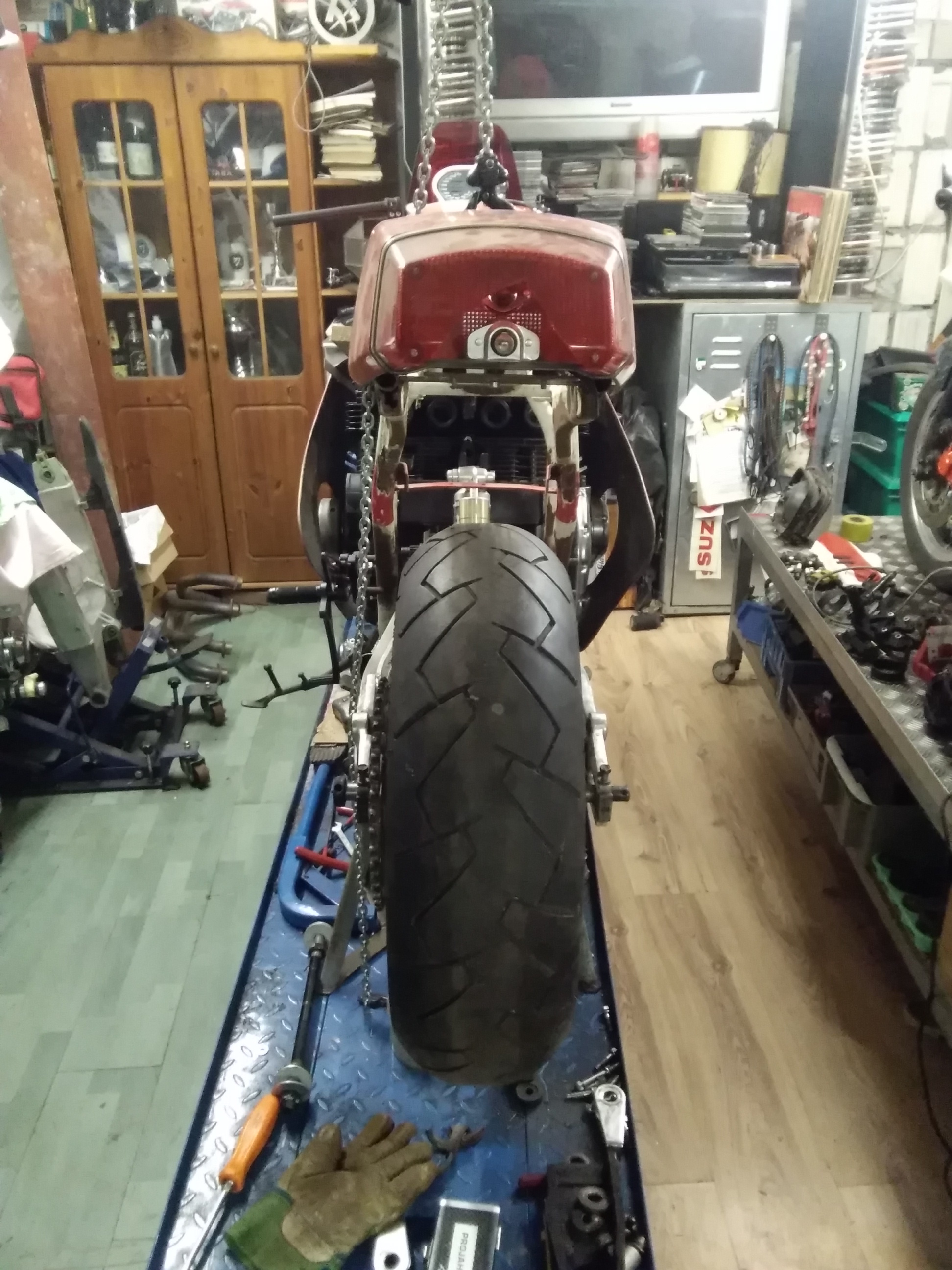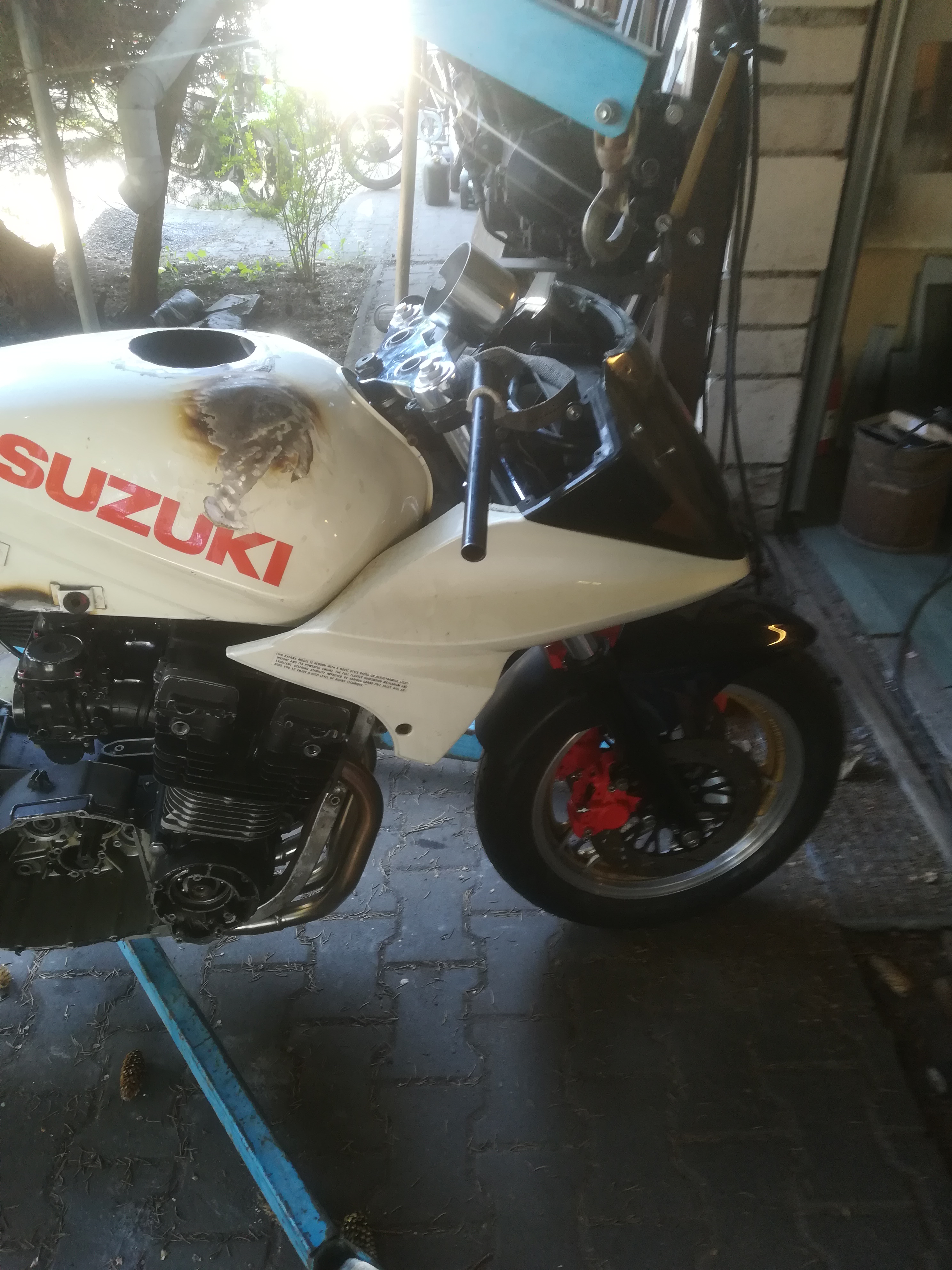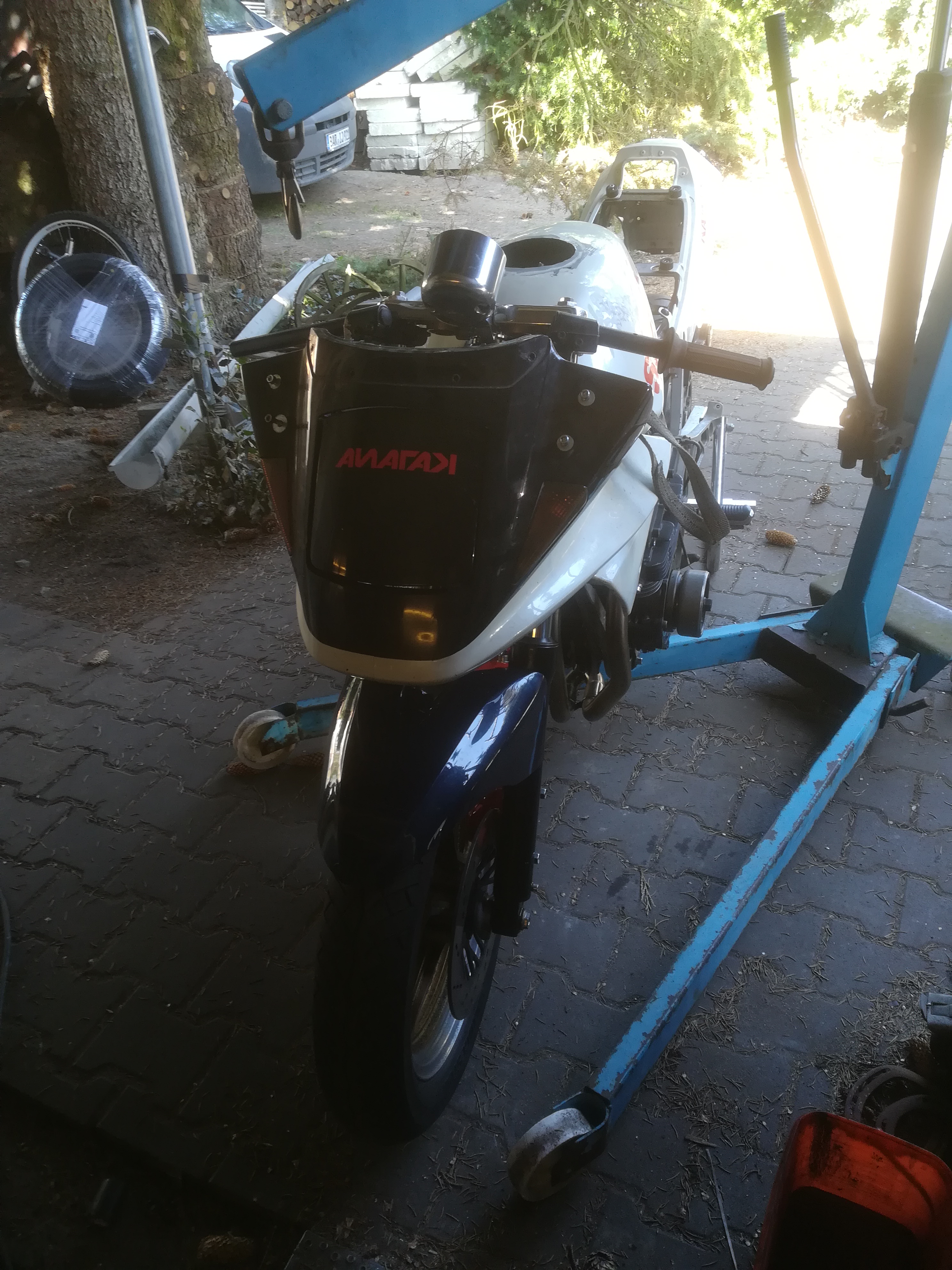Jetzt komm ich mal zu meinem Sorgenkind Nr 1. Einige werden sich noch an meine ro/we Kati erinnern. Steht ja jetzt auch schon 3-4 Jahre auf der Rampe. Nun ging es weiter. Gabel von der Yamaha YZF 1000 R mit Vorderradfelge, fehlen nur die Bremsscheiben, Sättel sind von der R1. Dann hab ich endlich den Spoiler von Gimbel gekauft. So, ranhalten und festschrauben. Nix da, passt vorn und hinten nicht. Ständig war mein Edelstahlkrümmer im Weg. Okay, Krümmer ab und Originalen angeschraubt. Nächstes Problem, um dn Spoiler zu montieren, muss man das Motorrad ein halber Meter in die Luft heben, um das Dingen zu zu kriegen. ALPTRAUM