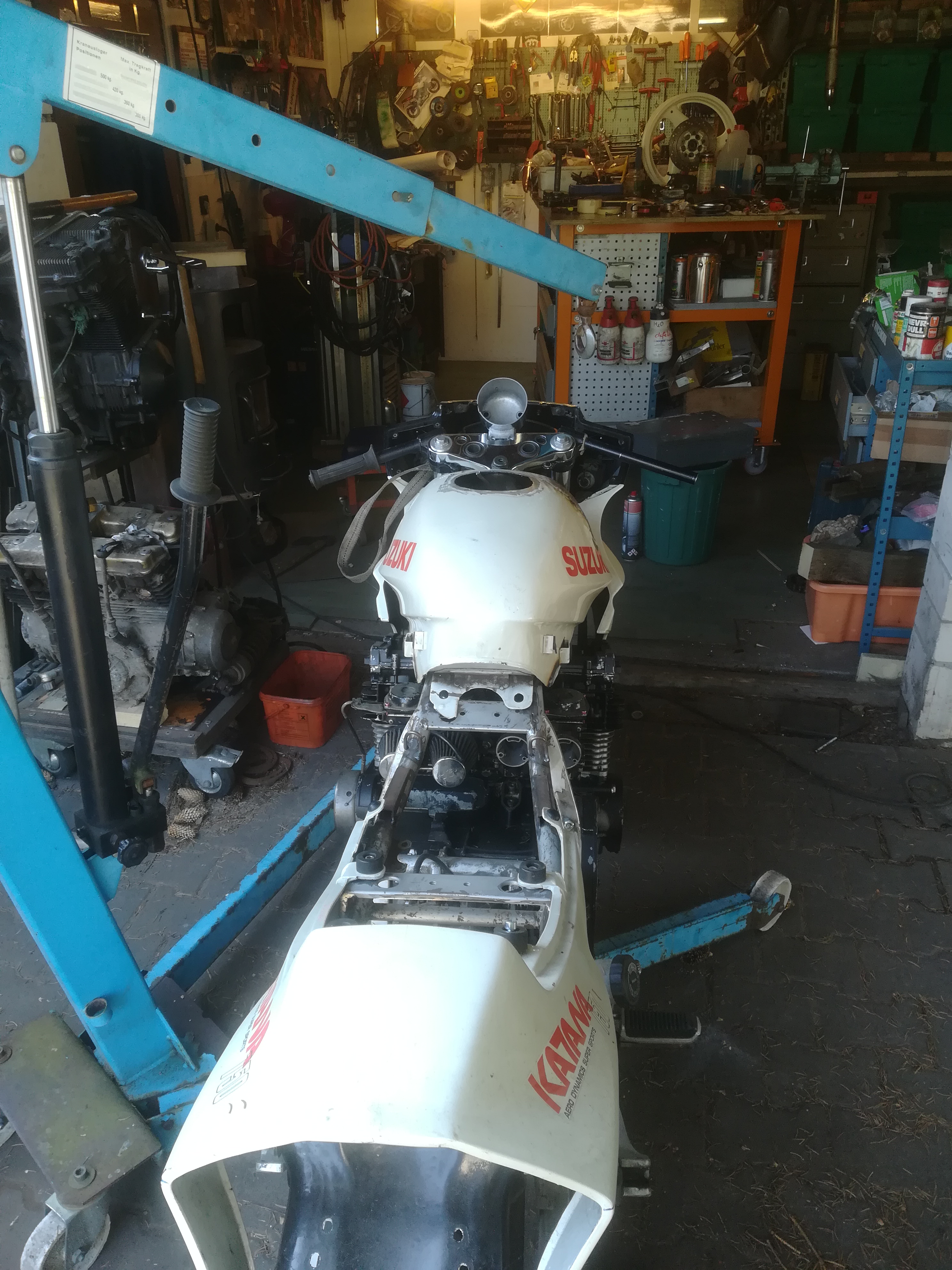 Hab mal wieder gebaut und mit Gabel weiter gemacht. Ein wilder Mix aus 4verschiedenen Suzukis musste her halten. O/u Gabelbrücke, Standrohre von der Trude, wegen der Länge, Stummel Gsx /r, Tauchrohre und Flügel von der 900 RF, Bremse und Vorderrad 11 EF. Vorher gemessen, ob die Gabel sich im Hilfsrahmen dreht. Einbauen. Die Freude war aber nur ganz ganz kurz. Beim ersten Lenkeinschlag stieß nicht die Gabel am Hilfsrahmen an, sondern die untere Gabelbrücke am Stellmotor der Klappi. MÄNNO!! Der Supermarkt war offen und verkauft Bier. Wat für'n Glück