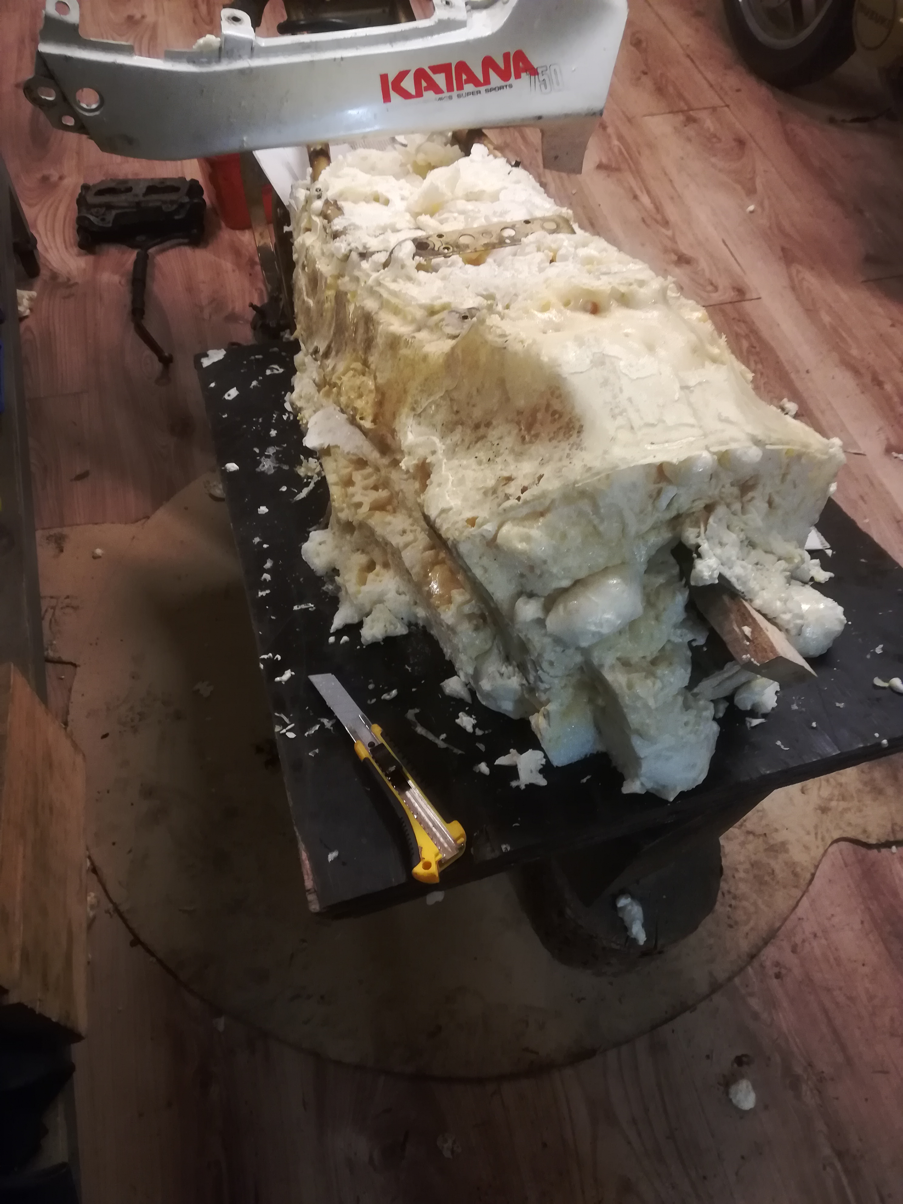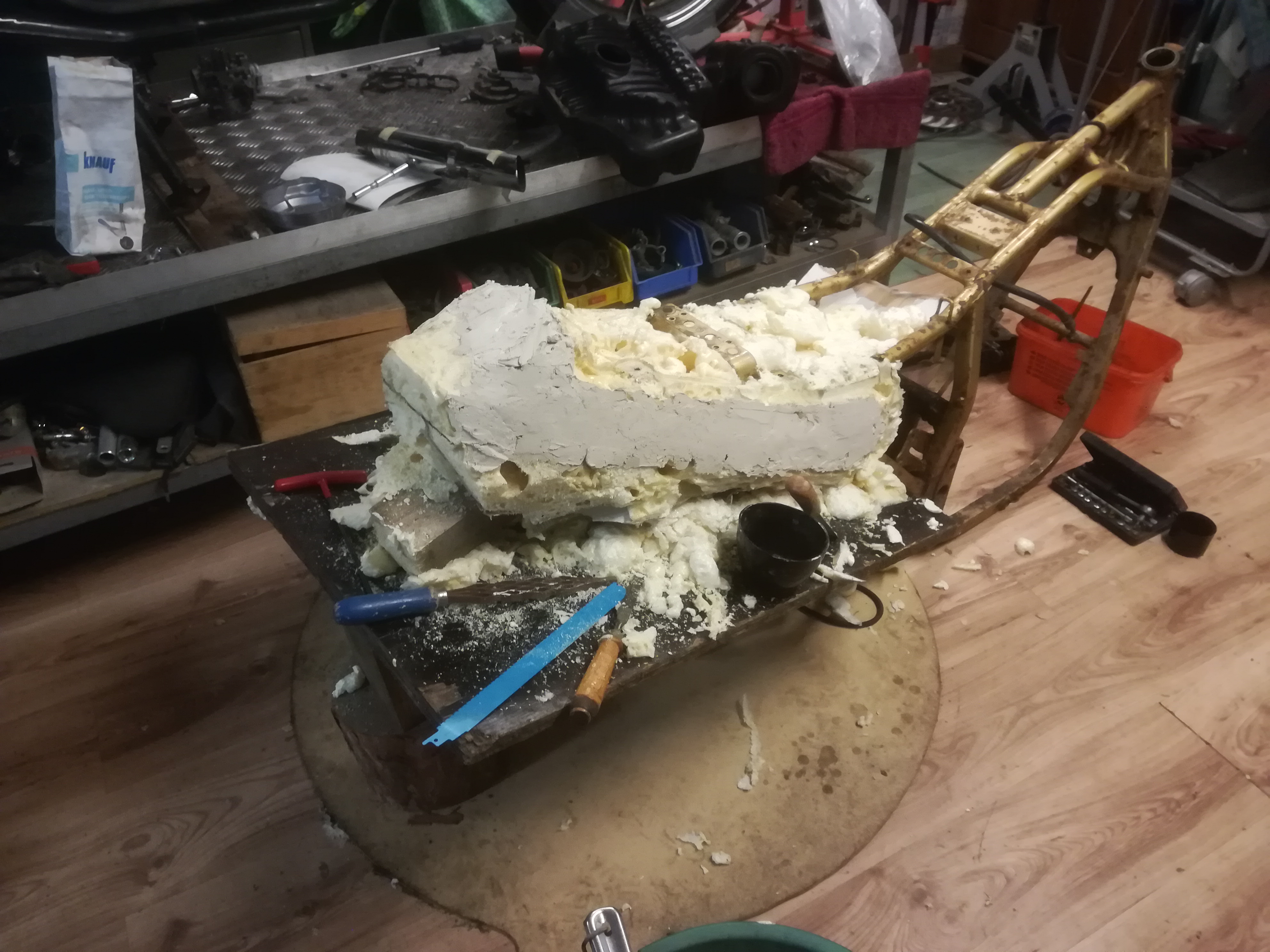 Es geht mit der Sitzbank weiter, da ja die Auspuffanlage unter dem Sitz laufen soll und die Originalität der der Verkleidung weitestgehend beibehalten wird, musste ich selbst Hand anlegen. Die Heckverkleidung auf den Blanko Rahmen verschraubt und zu geschäumt. Der Abdruck ist halbwegs in Ordnung, spachtel jetzt mit Gips nach