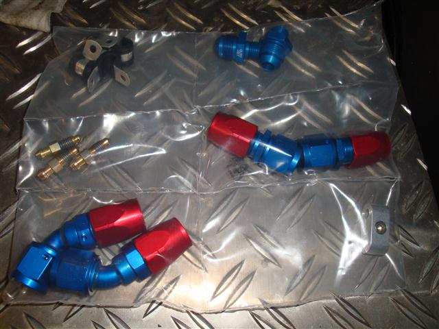 Wenn ich ehrlich bin, kann ich diese rotblauen pornösen Fittings nicht besonders leiden. Es gibt die auch in schwarzsilber, sind dann etwas teurer und sehen tausendmal besser aus. Leider war alles außer dem letzten kleinen Adapter direkt am Motor in "schön" lieferbar. Das kleine Scheißding gab's nur in blau. Mit diesem Mix hätte ich nun garnicht leben können, also, Arschbacken zusammen und alles in blaubunt gekauft. Ich tröste mich damit, daß ich so ein ein paar Euro gespart habe, weil zusammen mit den schönen Anschlüssen auch ein anderer Schlauch fällig gewesen wäre. Den anderen hatte ich noch liegen...