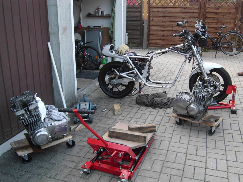 Im Sommer musste ich meinen Motor wechseln. Wir haben das mit 2 Mann gemacht und dabei so einen Motorradheber benutzt. Auf den Heber ein großes Brett und 2 Kanthölzer gelegt. Den Motor dann auf das äußere Kantholz gestellt und den Motor mit dem Heber dann bis kurz vor den Rahmen gefahren. Anschließend den Heber soweit hoch gepumpt, dass der Motor über den Unterzug ging und weiter rein gefahren. Den Motor dann über den Unterzug hinweg auf das vordere Kantholz gehoben, ausgerichtet und runter mit dem Heber.