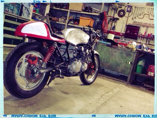 Servus Claus ! Erster Blick aufs Bild : Aha. Cafe Racer. Blanker Tank, rotes Bürzel - wird schon ne Guzzi sein - Uuuuups ?