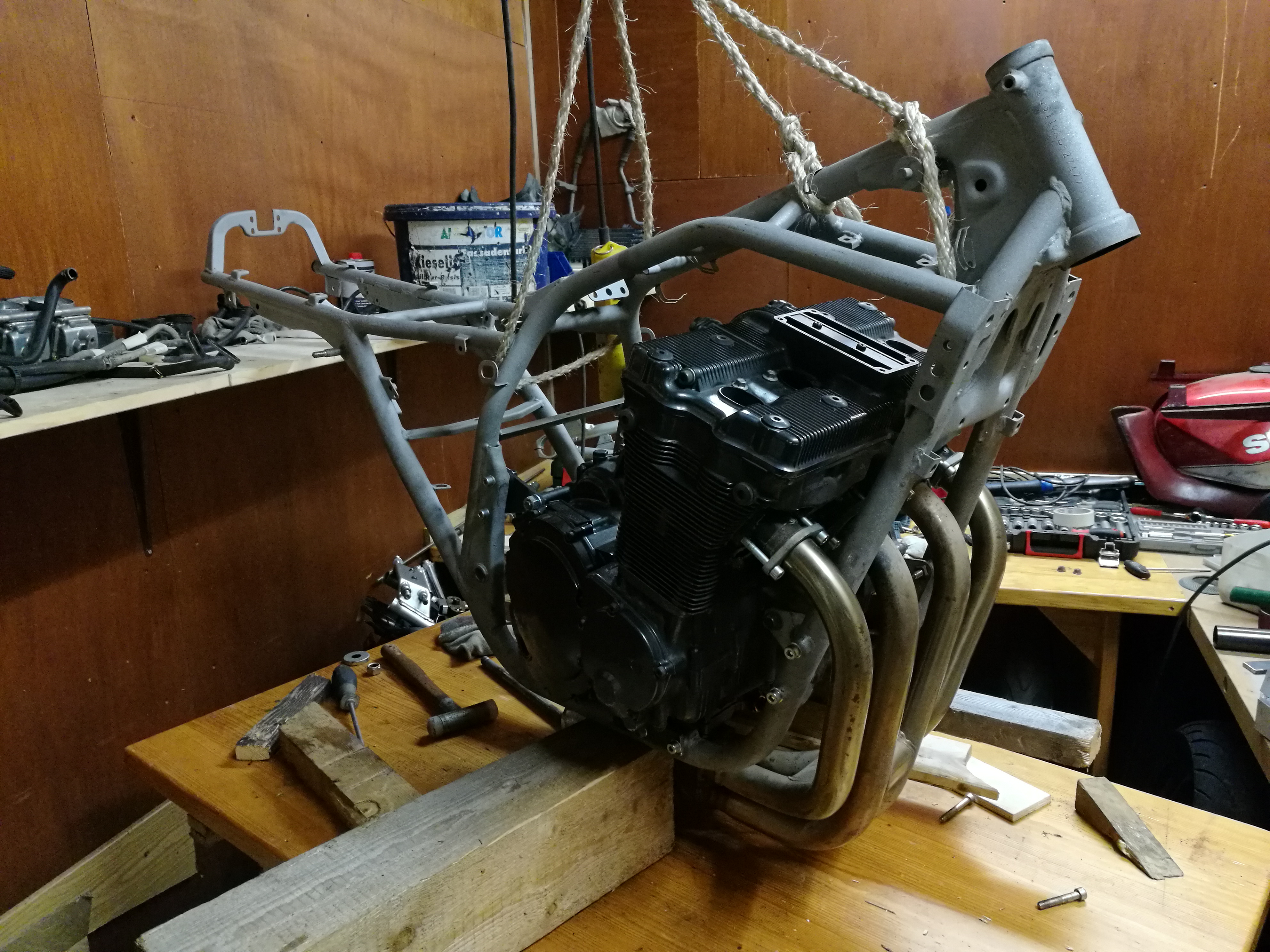 Mal wieder ein Bild von meinen Katana-projekt! Der Rahmen ist lackiert, und der Motor hängt im Rahmen! Der Krümmer ist auch schon dran!