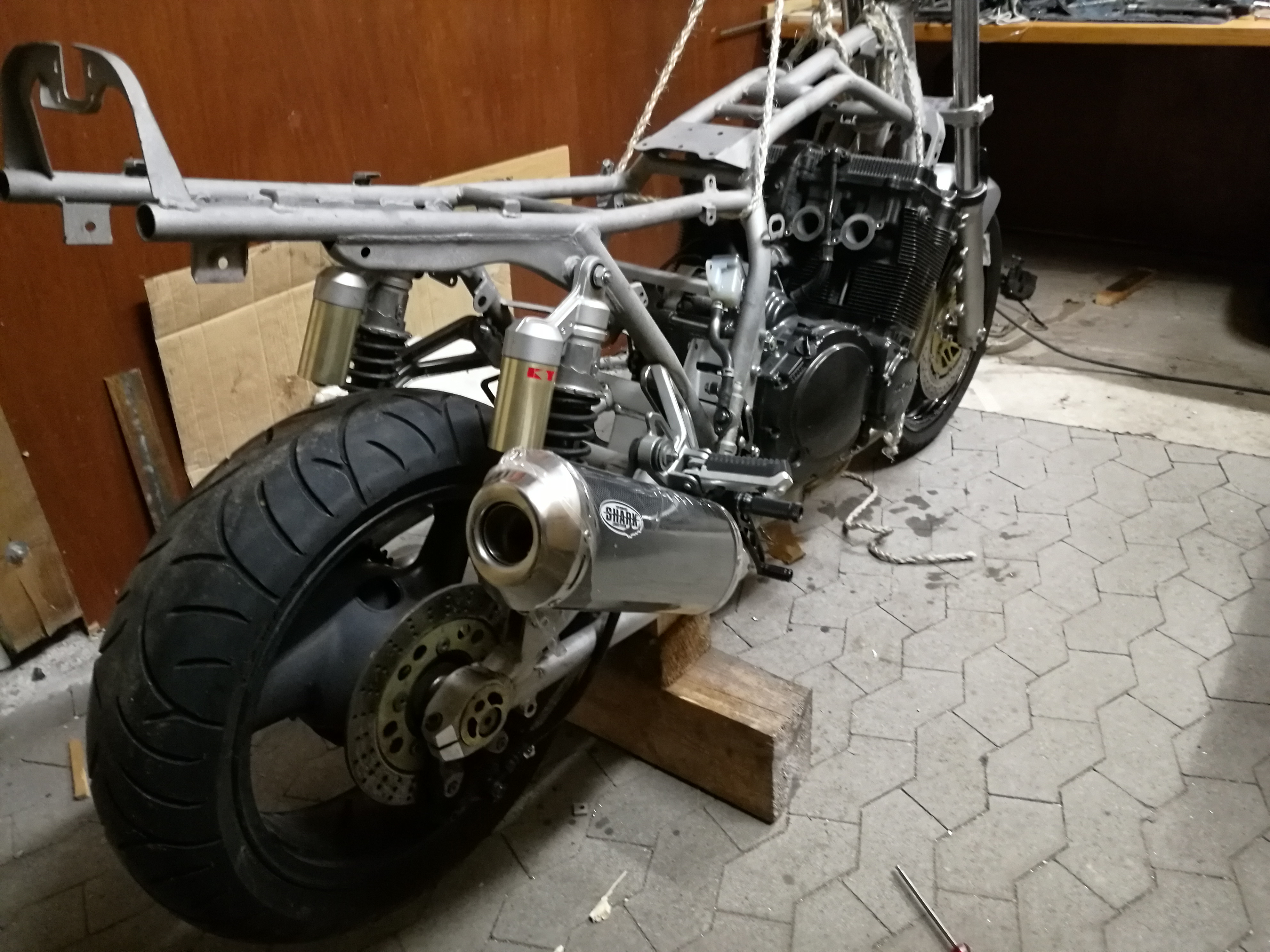Hallo, und Guten Morgen! Jetzt muss ich mich auch mal wieder melden und berichten wie weit ich mit meinen Umbau bin! Nach langem Warten (13 Wochen) hab ich meine Gabel von der Firma bekommen die mir ein neues Gabeljoch drehen und einpressen sollte, zurück bekommen! Da war natürlich die Motorrad Saison schon voll im gange, und die Motivation weiter zu Schrauben beim Arsch! Im Herbst bin ich dann wieder in der Werkstatt und habe sie soweit fertig gemacht! Die Lackteile wollte ich dieses mal mit Carbon Folie überziehen! Wie sie dann fertig zusammen geschraubt war, und ich sie länger betrachtet, gefiel mir das schwarze Carbon nicht mehr! Habe sie dann wieder auseinander genommen und die Folie wieder ab gemacht! Jetzt werden die Teile lackiert! Muss mir nur noch was besonderes einfallen lassen! Das Bild zeigt sie wie sie jetzt in der Werkstatt steht! Gruß Katanasepp