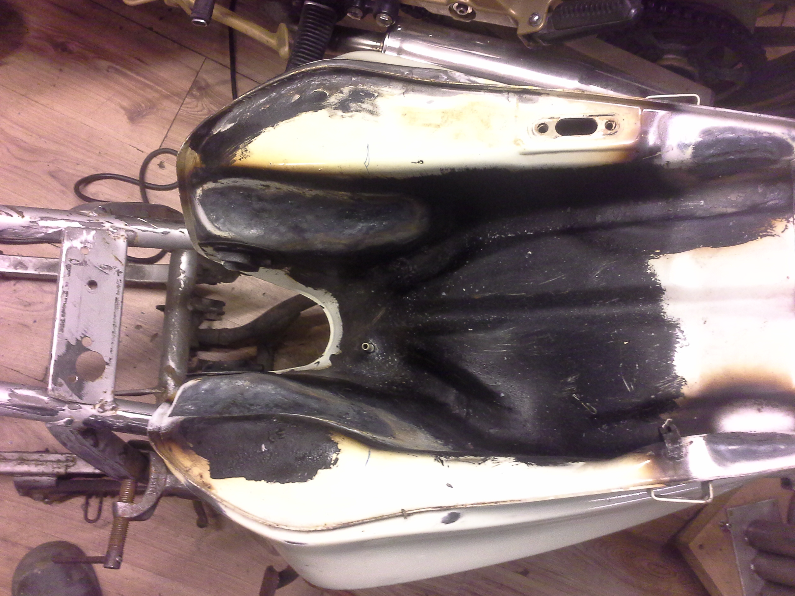 Es geht weiter, mit meinem Umbau an der 11er Klappi. Der Umbau gestaltet sich aber schwerwiegender, als angenommen. Hab den Tank auf dem Rahmen neu positionieren müssen, da er zu hoch angesetzt war.hab das erst gesehen, als ich die originale Klappi daneben gestellt hatte. Schon war das nächste Problem da, der Klappi Tank passt zwar auf dem 11er EF-Rahmen, geht aber nicht tief genug runter.Also und hat der erst mal eine Wärmebehandlung erfahren, nebenbei hab ich dann auch noch gesehen, das er an 2 Stellen durch gerostet war. Also auch erstmal zugeschweißt. Und dann waren ja noch Dellen im Tank,auch die sind entfernt , und es wird ein R-Tankdeckel eingescheißt. Bilder im Anschluss. Bis denne