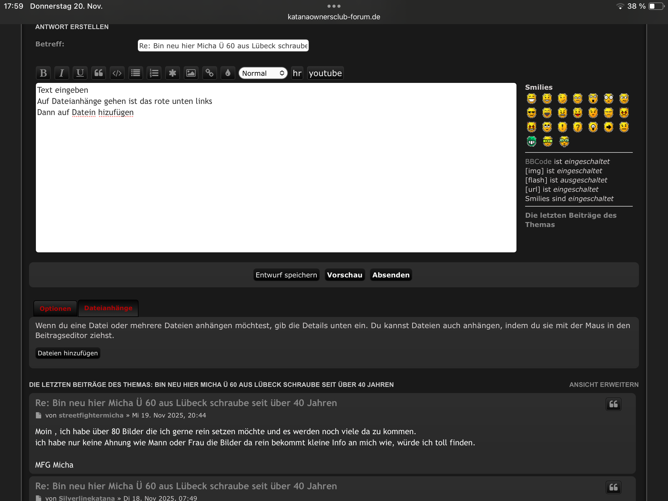 Bilder kannst du unten über den Reiter "Datenanhänge" anfügen oder auch im Text platzieren.