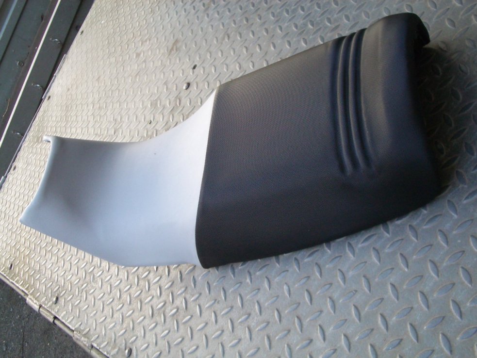 750er Sitzbank beim Sattler: vorne grau strukturiert und hinten feines schwarzes Rhombusmuster. Keine zusätzlichen Nähte, original Rillen im Soziusbereich wieder mit rein.