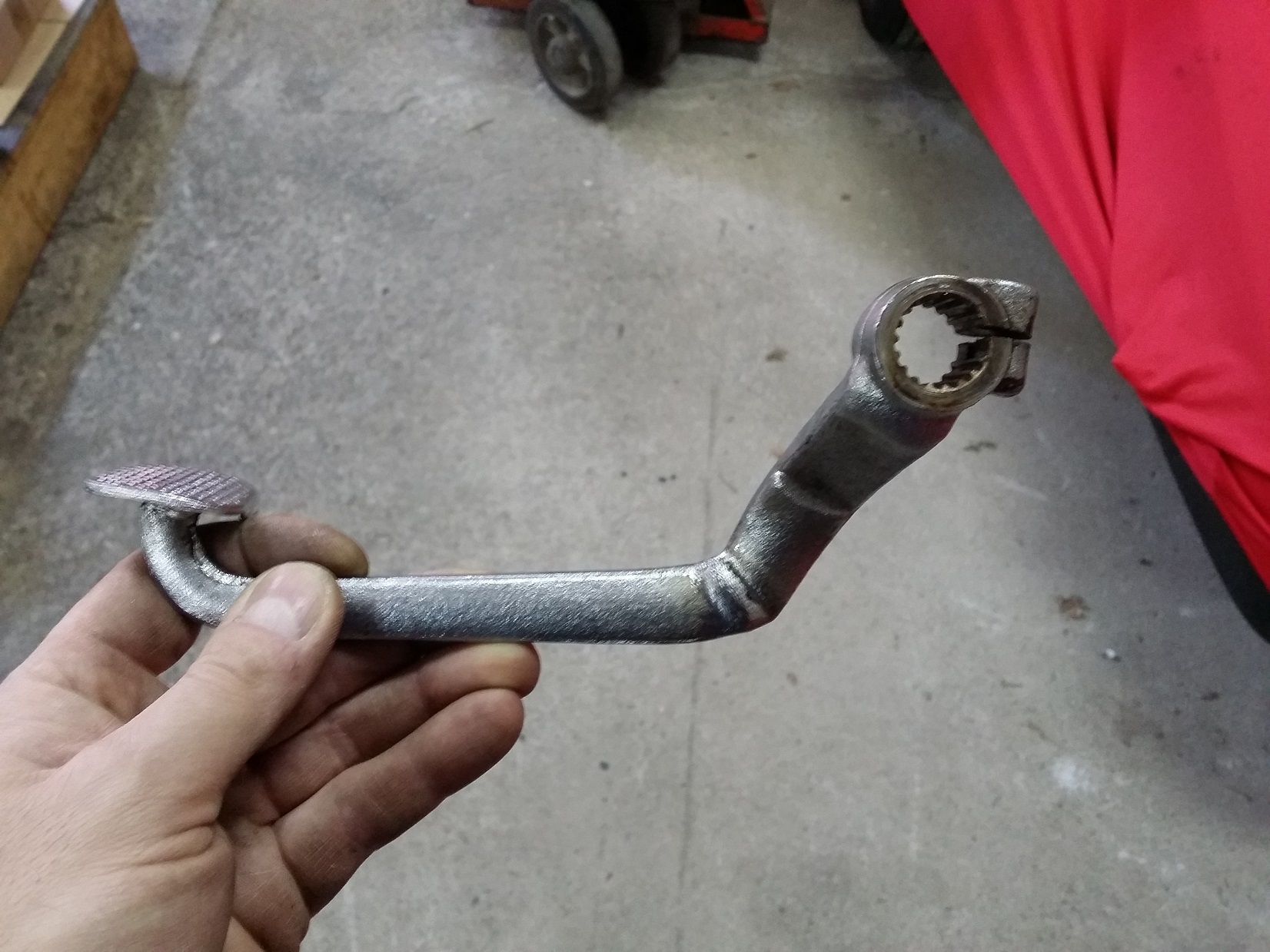Bestehen aus 15 mm Aluplatten, GS 550 Katana Bremshebel (umgeschweißt), Gimbel Schalthebel, Schaltgestänge mit Gelenkköpfen, 28 mm Alufußrasten mit Aufnahmebolzen