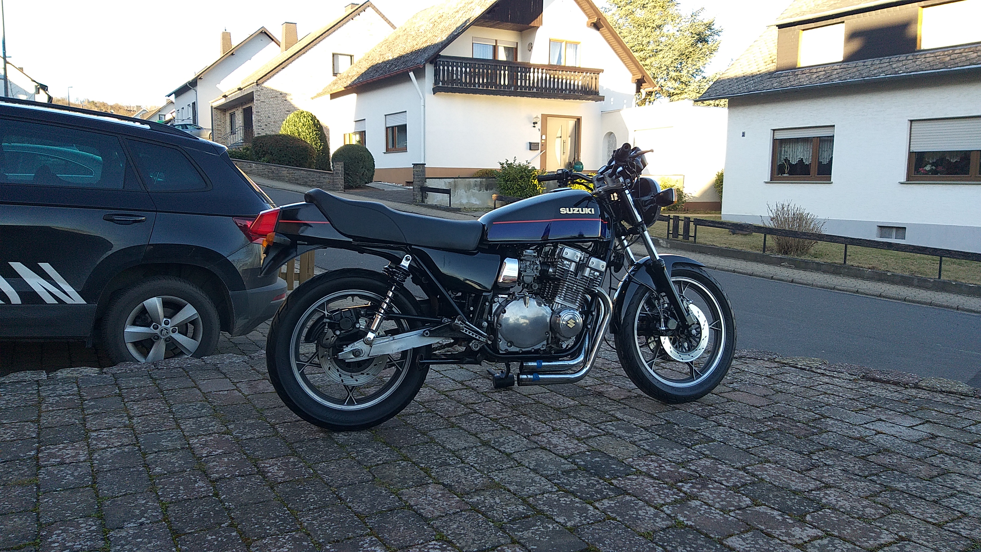 Die Basis ist eine GSX750E in einem sehr guten Zustand. Die 89 Tsd. Km. sieht man ihr nicht an. Die letzten 20 Jahre verbrachte sie gut konserviert in einem Wohnzimmer. Nach dem Tod des Besitzers, wurde die Sammlung von Klaus Hülsmann gekauft. Da er nur die schöne 6 Zylinder CBX1000 wollte wurden alle anderen Bikes verkauft.