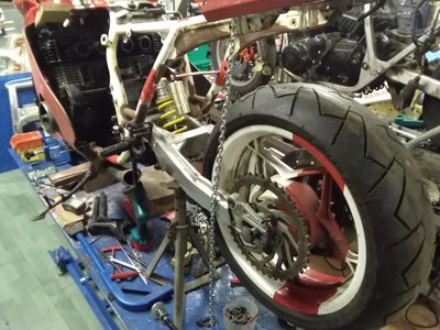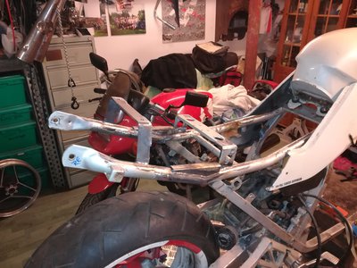 Hab mal wieder gebaut und mit Gabel weiter gemacht. Ein wilder Mix aus 4verschiedenen Suzukis musste her halten. O/u Gabelbrücke, Standrohre von der Trude, wegen der Länge, Stummel Gsx /r, Tauchrohre und Flügel von der 900 RF, Bremse und Vorderrad 11 EF. Vorher gemessen, ob die Gabel sich im Hilfsrahmen dreht. Einbauen. Die Freude war aber nur ganz ganz kurz. Beim ersten Lenkeinschlag stieß nicht die Gabel am Hilfsrahmen an, sondern die untere Gabelbrücke am Stellmotor der Klappi. MÄNNO!! Der Supermarkt war offen und verkauft Bier. Wat für'n Glück