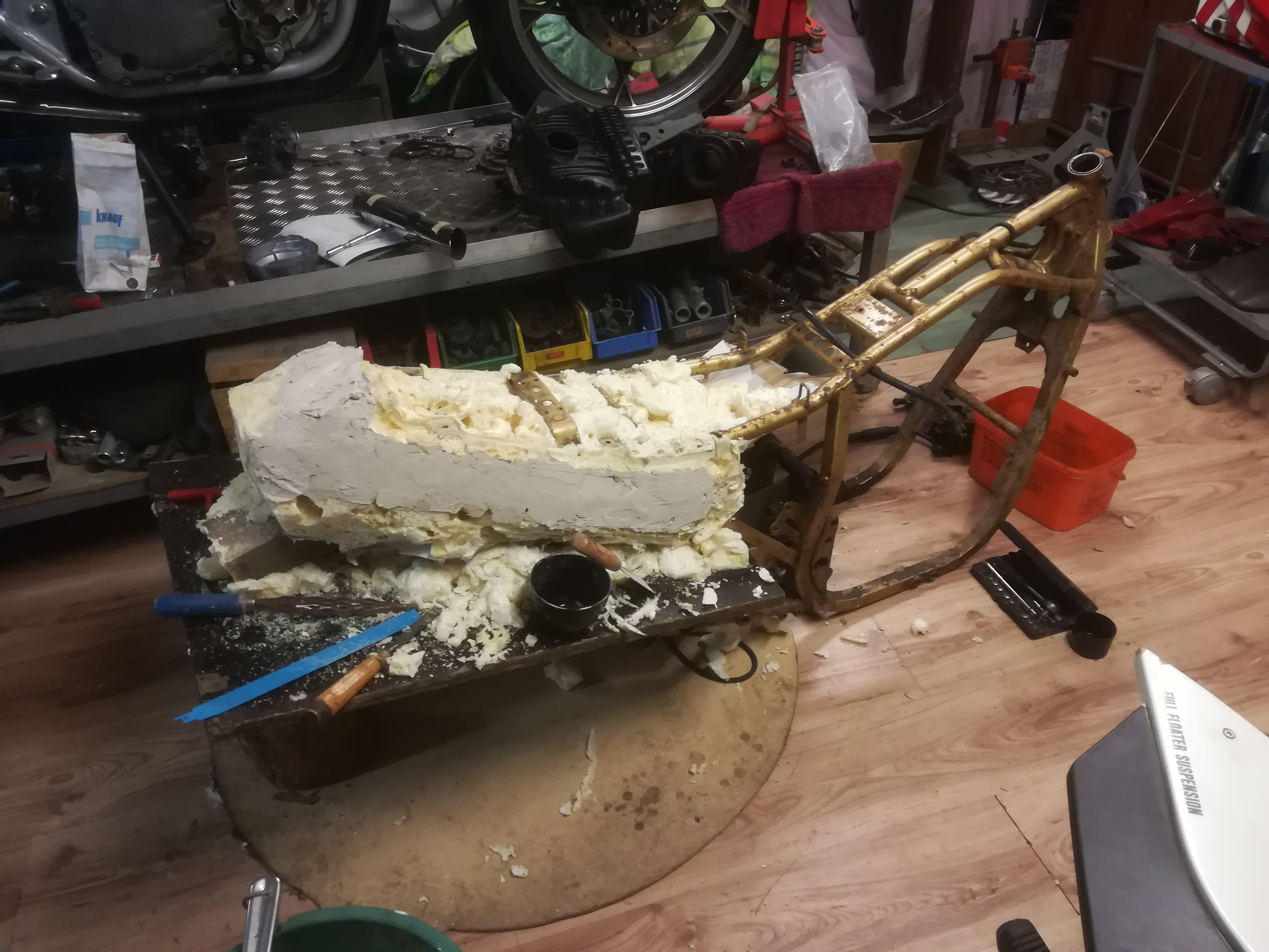 Es geht mit der Sitzbank weiter, da ja die Auspuffanlage unter dem Sitz laufen soll und die Originalität der der Verkleidung weitestgehend beibehalten wird, musste ich selbst Hand anlegen. Die Heckverkleidung auf den Blanko Rahmen verschraubt und zu geschäumt. Der Abdruck ist halbwegs in Ordnung, spachtel jetzt mit Gips nach
