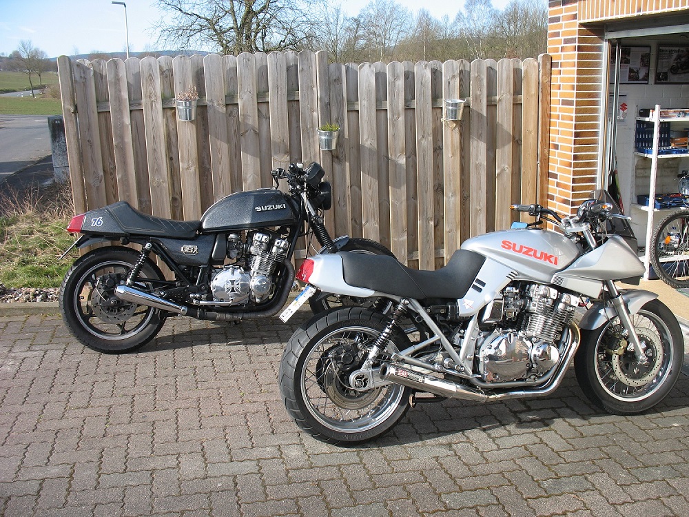 Hallo ,hier mal ein aktuelles Bild meiner beiden Suzi Geschwister. Die Katana hat aktuell einen neuen Lenker u. das orig. Rücklicht.Baustellen in Moment beendet ! Mit der Kat gehts im Mai nach Österreich.